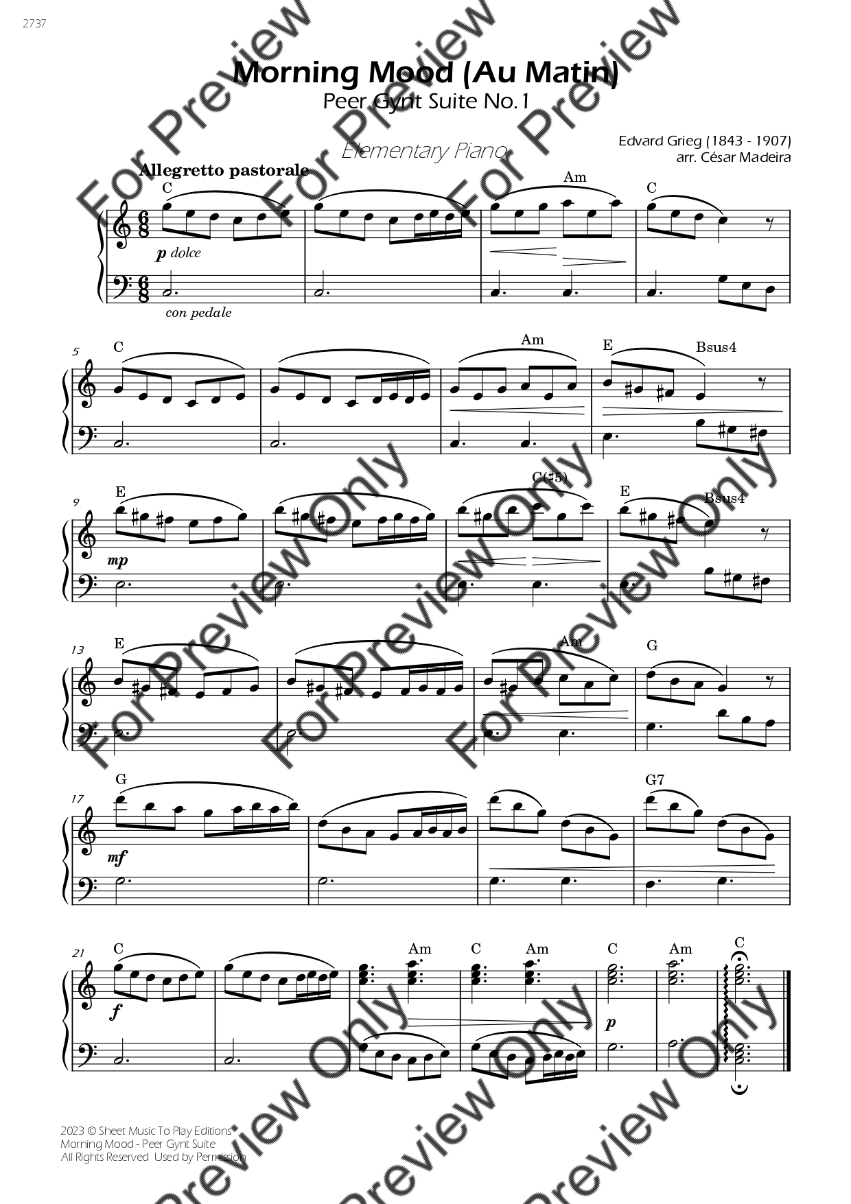 Morning Mood from Peer Gynt by Edvar Grieg. Arrangement for Elementary/Very Easy Piano. With Full Score. Have fun!