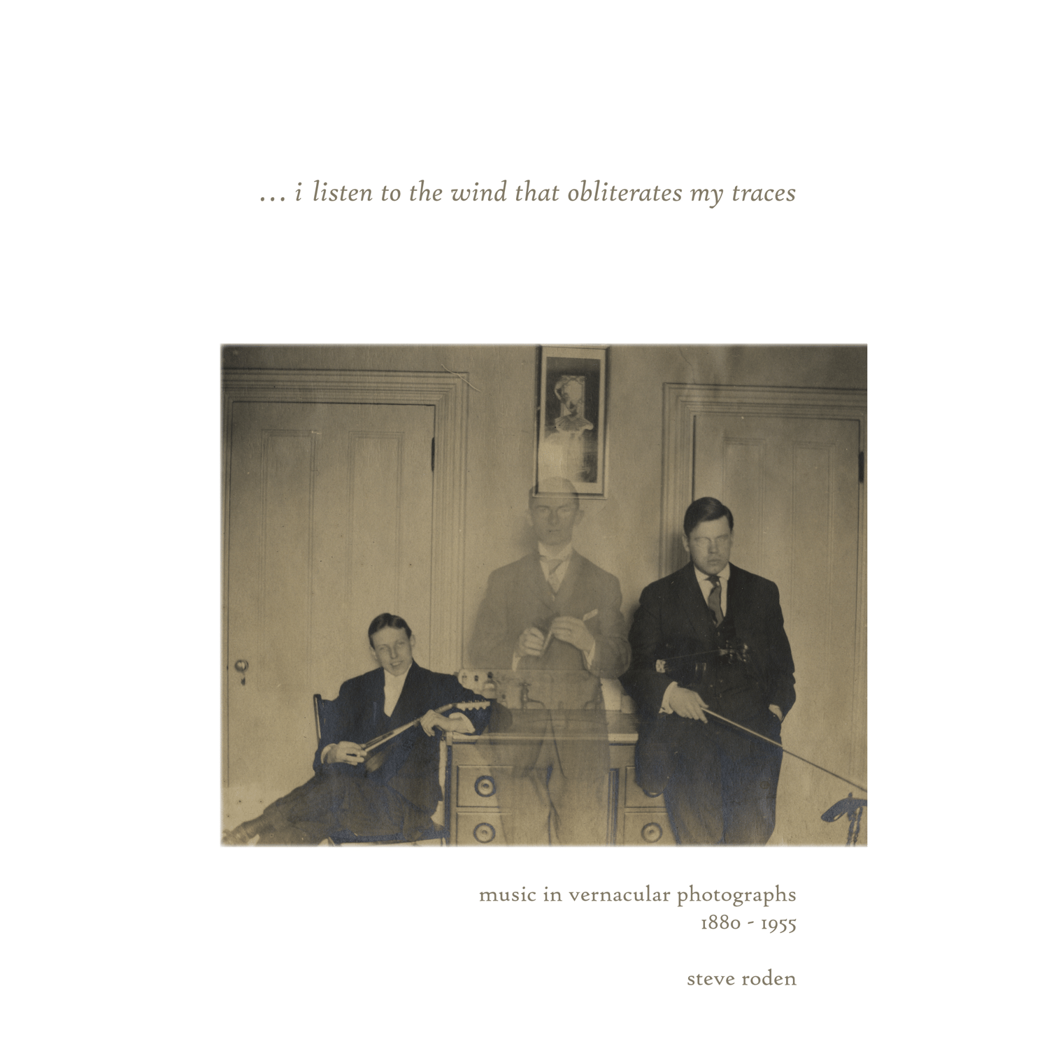 ...i listen to the wind that obliterates my traces gathers together early photographs, 78 rpm recordings, and literary fragments into a haunting meditation on memory, sound, and image. Curated from internationally renowned artist Steve Roden’s personal collection, this work is not organized as a linear narrative but as a constellation of connections—vernacular portraits of anonymous musicians, amateur home recordings, professional studio sessions, and atmospheric sound effects collide with writings by Hamsun, Wordsworth, Nabokov, and others.