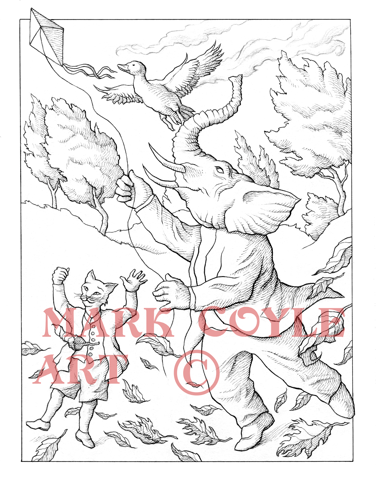 Color Duck and Elephant as they fly their kite on a gusty day. This detailed 8.5" X 11" page is a digital download. No physical item will be sent. The file is a large 300 DPI JPG.