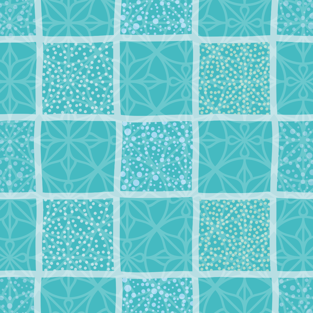 Blue and green doodle checkered vector repeat pattern with polka dot design.