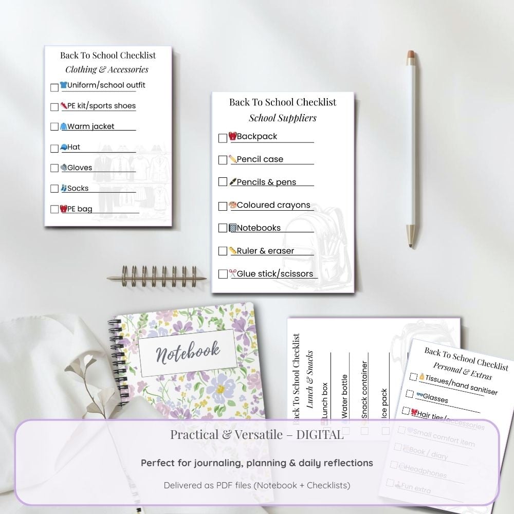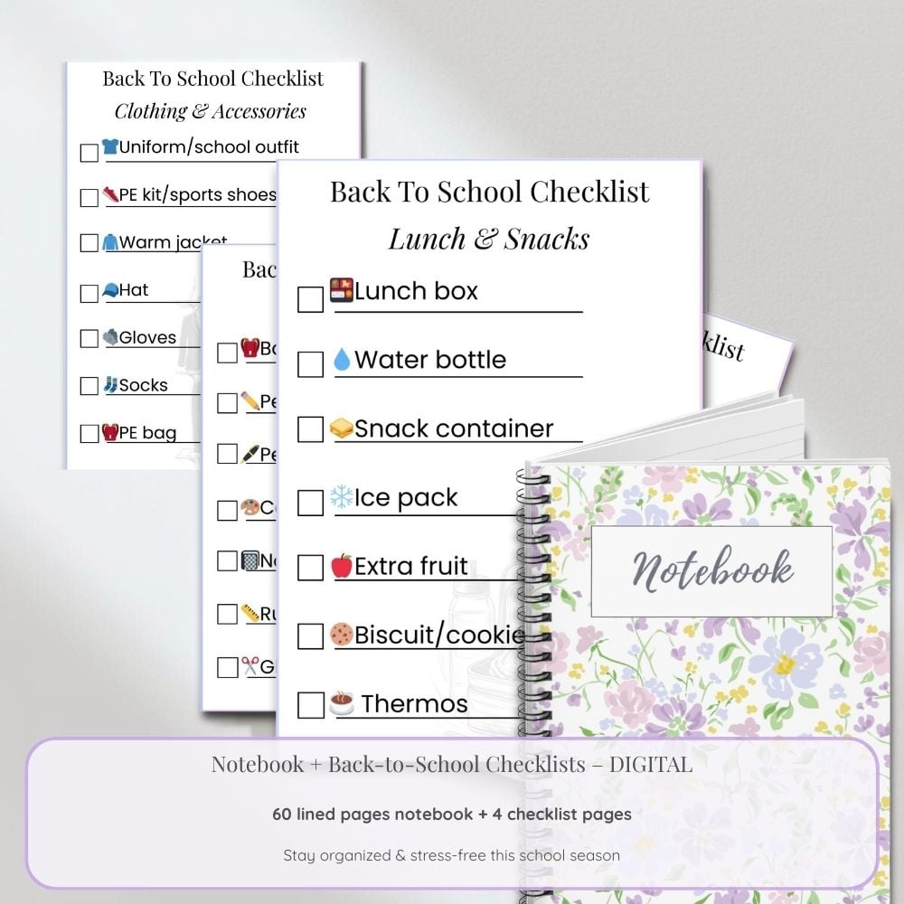 - 1 PDF file: Back-to-School Checklists – 4 practical pages to organize school supplies, clothing & accessories, lunch & snacks, and personal extras.