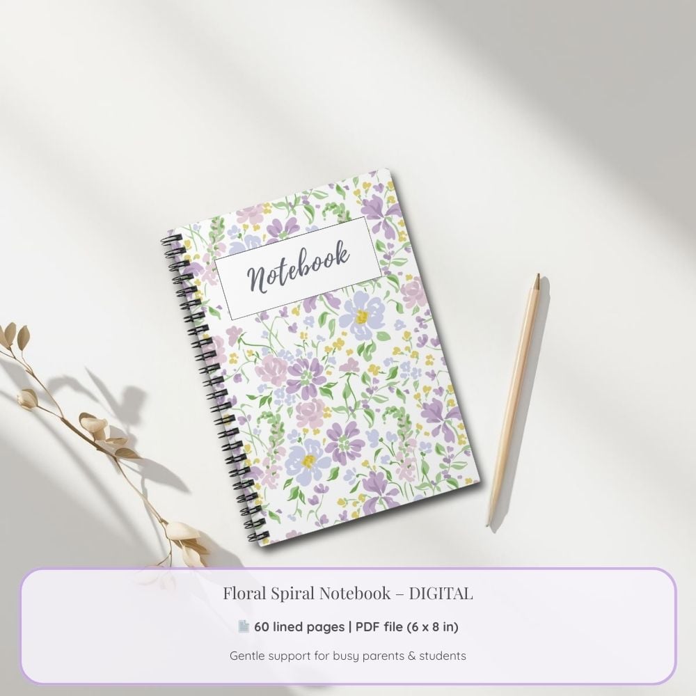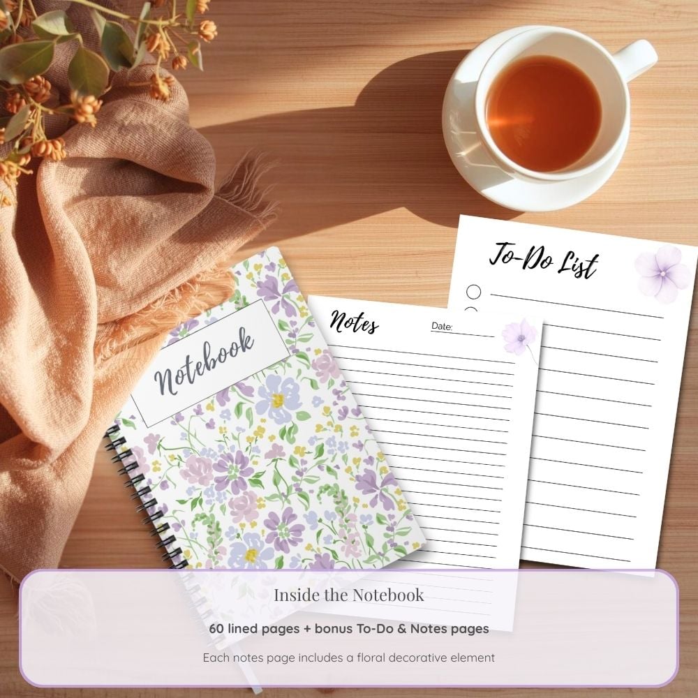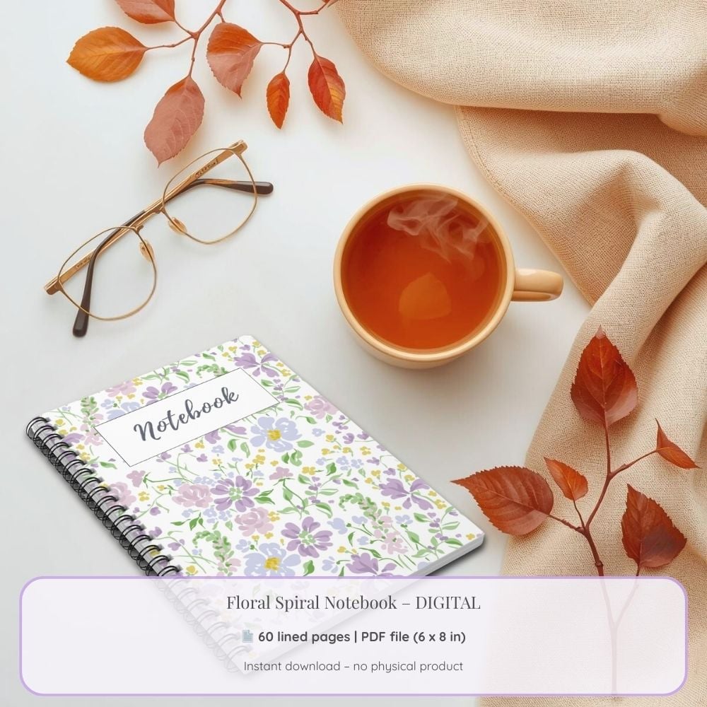 - 1 PDF file: Floral Spiral Notebook – 60 lined pages (6x8 inch), with a decorative floral detail on every notes page.