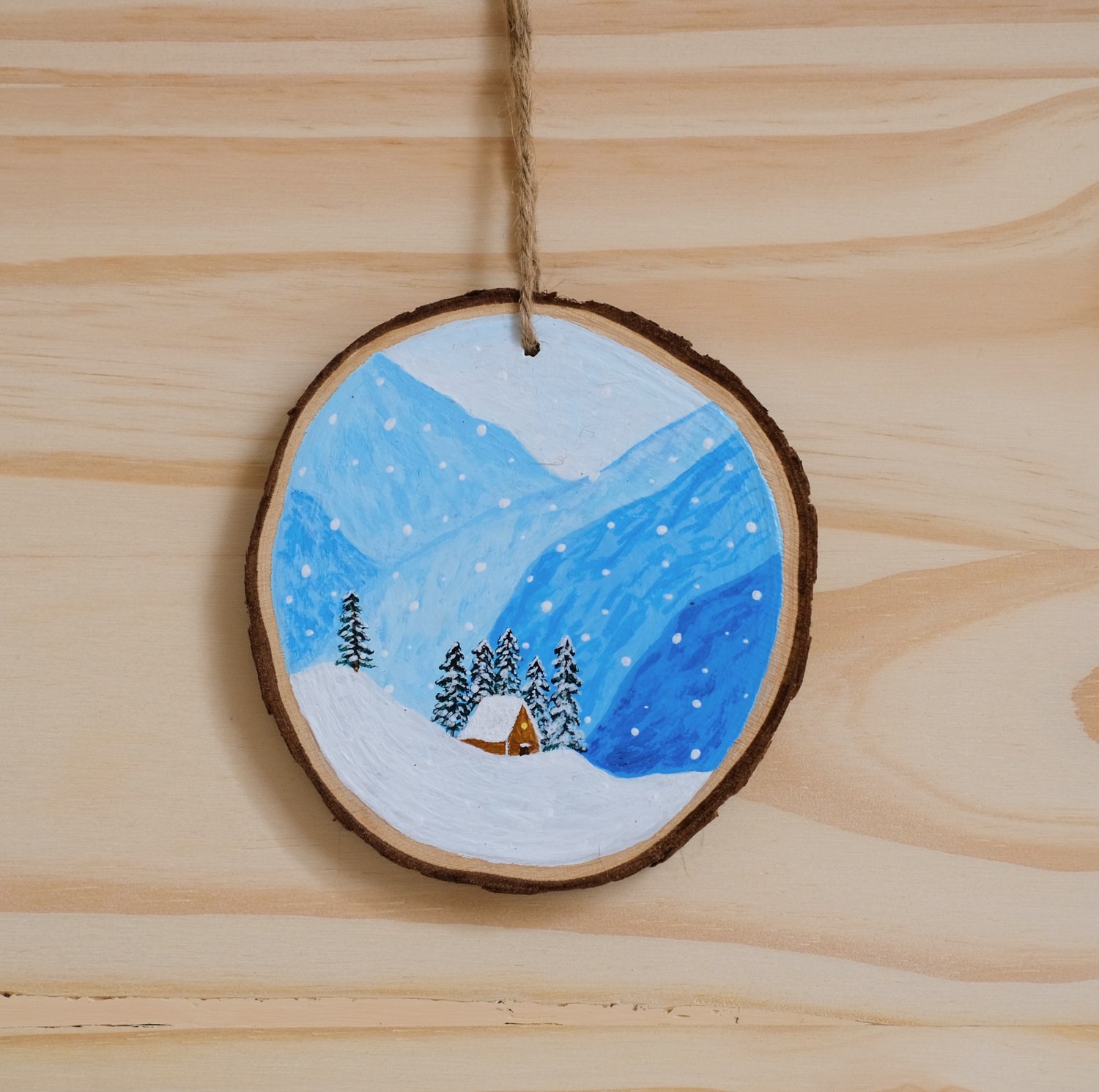 Snowy mountain cottage painted with acrylic paint on a pine wood slice.