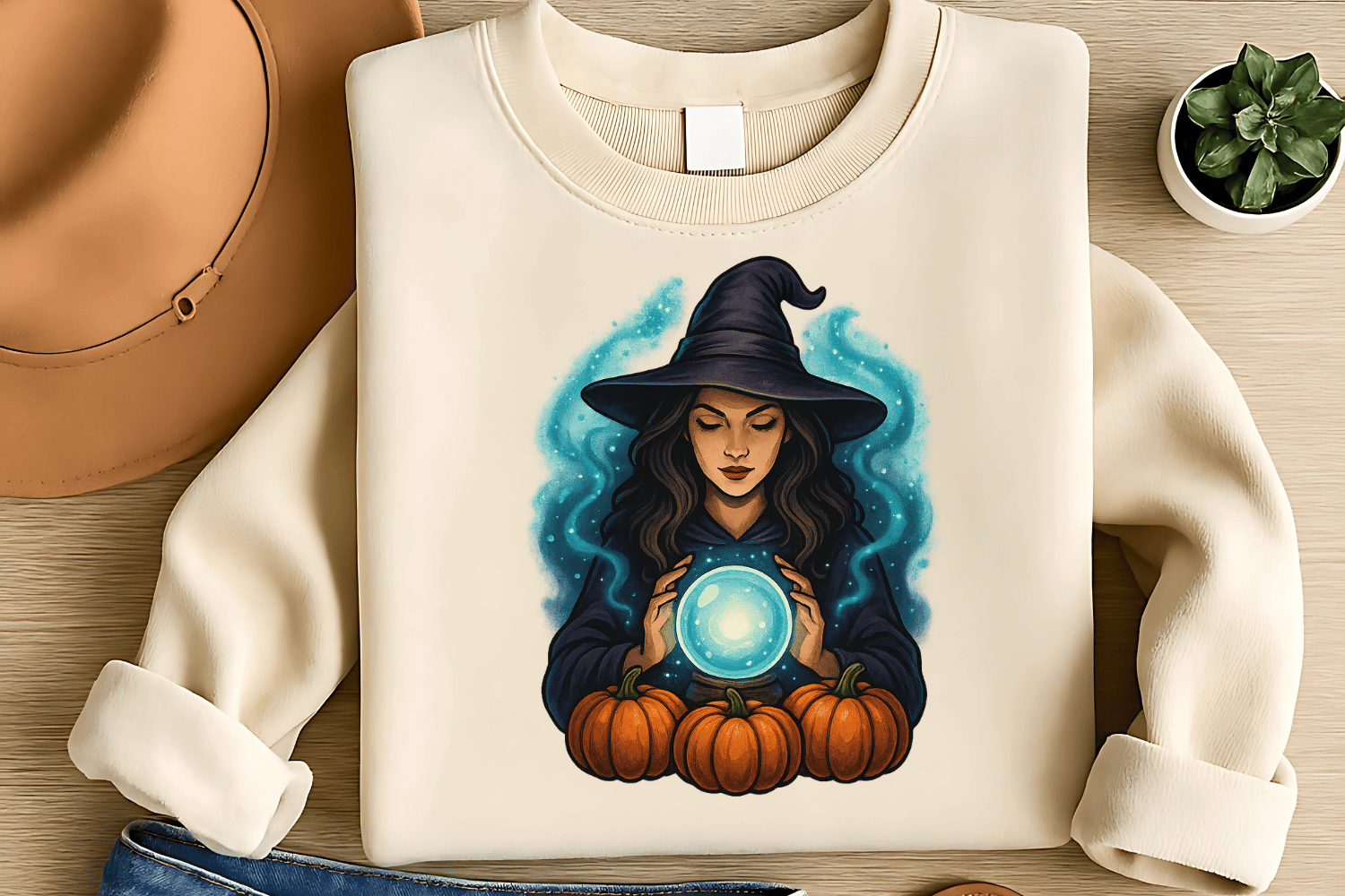 Spellbound Witch Sublimation PNG – Magical Glow Clipart for T-Shirts – Crystal Ball & Pumpkin Theme – 300 DPI Instant Digital Download