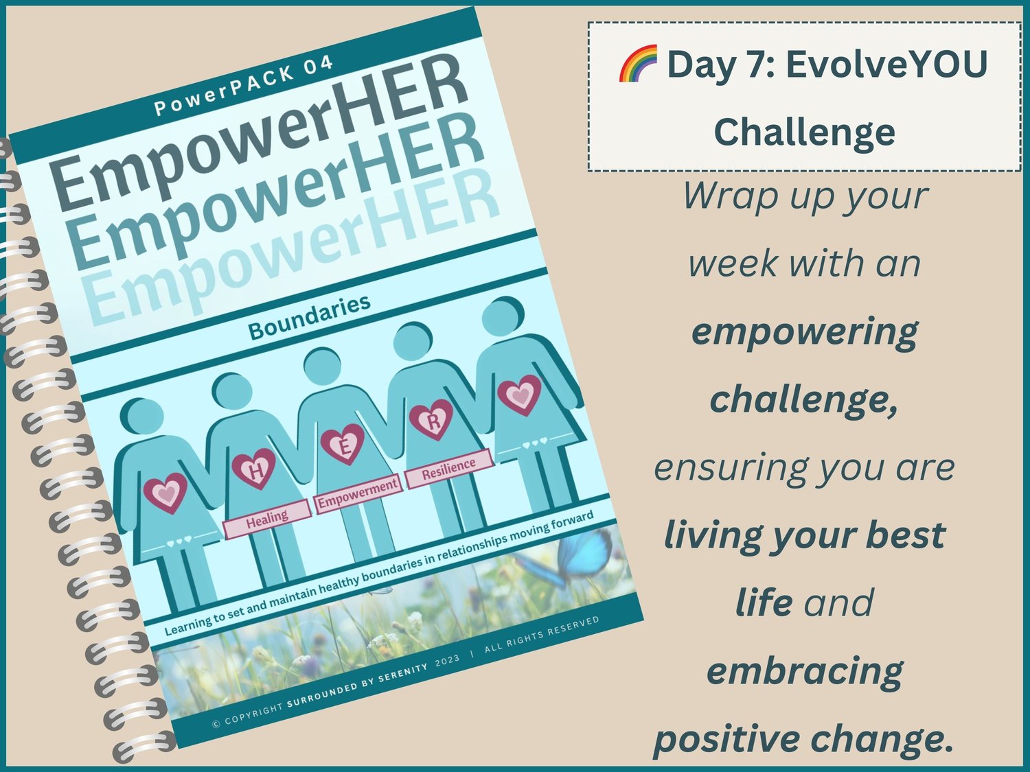 🌈 Day 7: EvolveYOU Challenge * Wrap up your week with an empowering challenge, ensuring you are living your best life and embracing positive change.