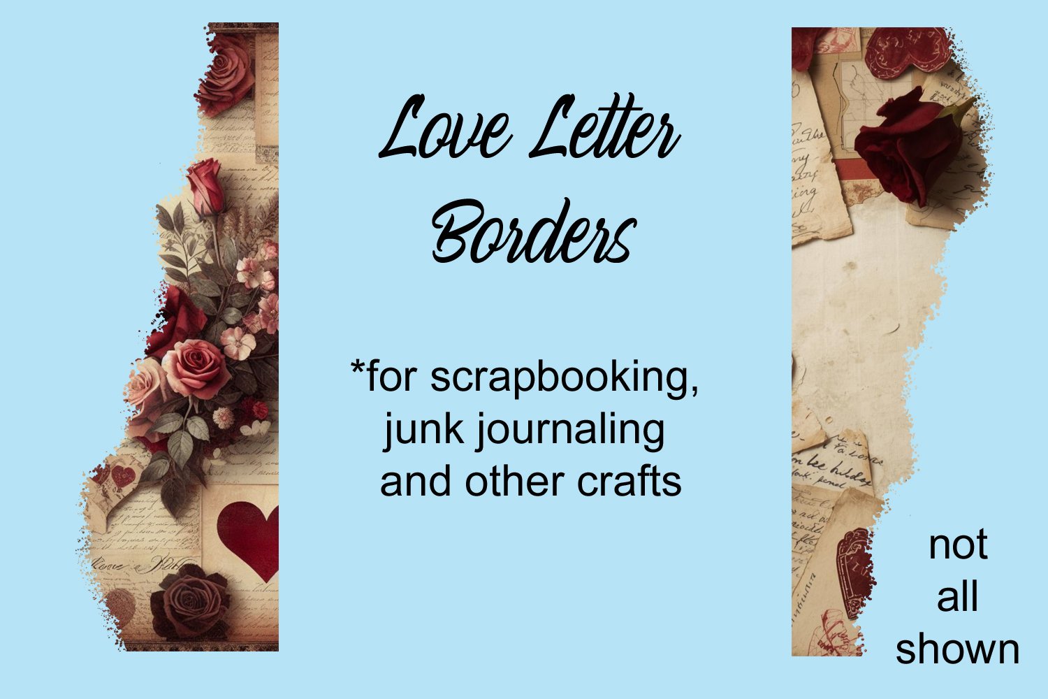 Keywords: Love Letter Borders, Vintage Rose Journal Strips, Antique Script Scrapbook Edges, Romantic Junk Journal Trim, Shabby Chic Paper Borders, Red Rose Ephemera Strips, PNG Borders, Vertical Layout, Vintage Script, Red Roses, Junk Journaling, Scrapbook Supply, Commercial Use, Shabby Chic Art, Valentine's Decor, Digital Download, Antique Textures, Heart Motifs, Love Lettering.