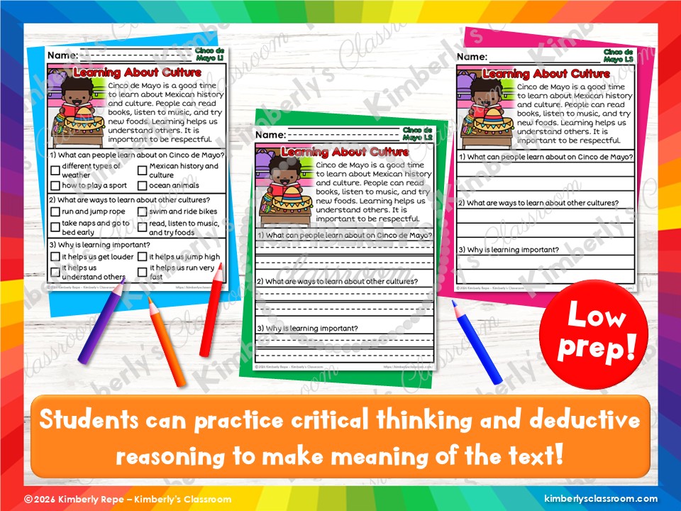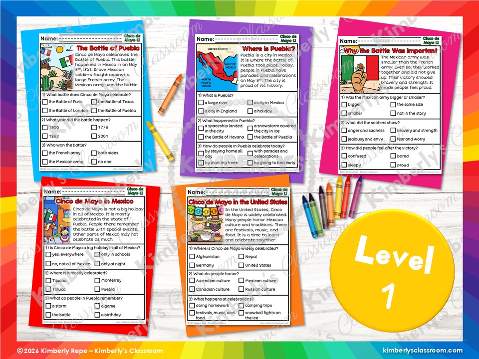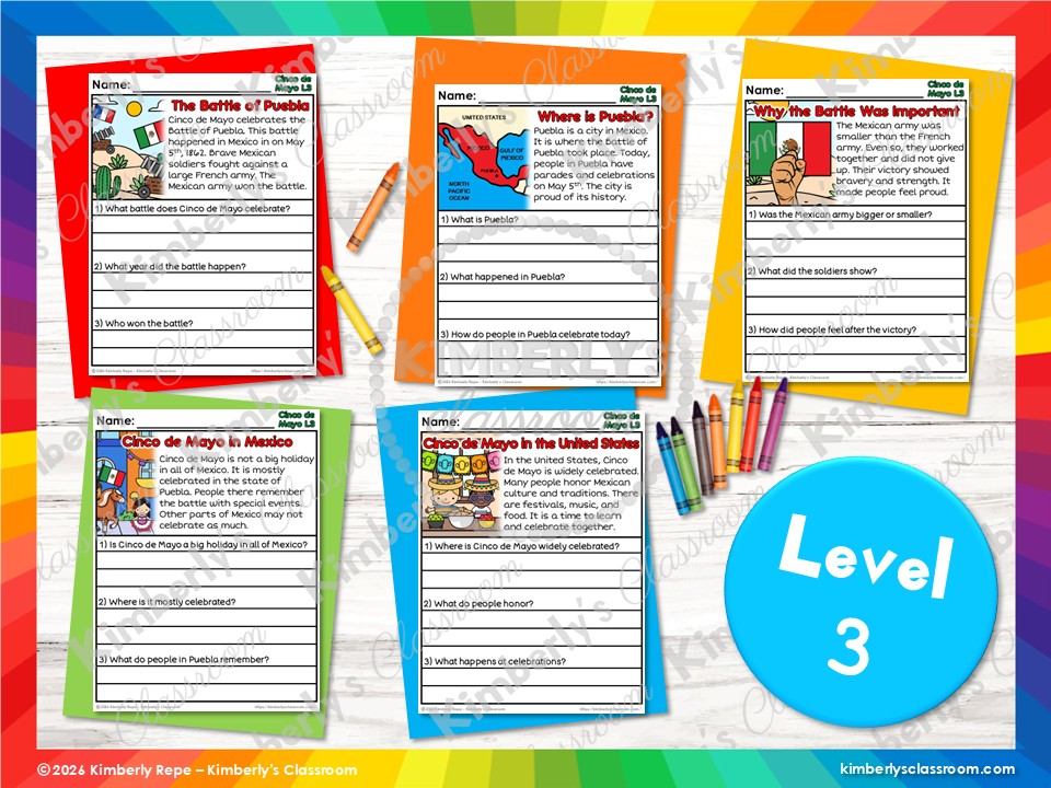 ❤️Learn about 10 important topics related to Cinco de Mayo, while practicing important reading comprehension skills and vocabulary with these differentiated, informational reading passages and questions (30 pages + answer key + black & white set)!