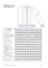 The pattern includes 10 sizes A (B, C, D) E, F, G {H, I, J} with finished garment bust circumference of 34 (38, 42, 46) 50, 54, 58 {62, 66, 70}” / 86 (97, 107, 117) 127, 137, 147 {157, 168, 178} cm.