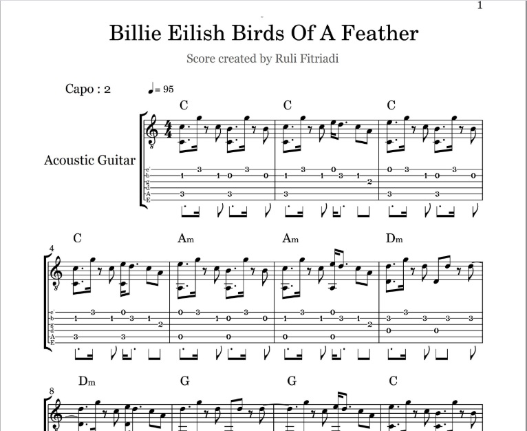 Easy solo guitar Birds Of A Feather by Billie Eilish sheet music score tabs