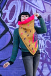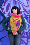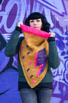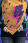 This bandana cowl is knit from the bottom up with a bit of garter stitch, a few yarn overs, and a whole lot of stockinette! There are two options for the collar, i cord edging or ribbing, and loads of colorwork details in duplicate stitch. These range from a simple large lightning bolt to a second contrast color for added depth to a collage of tiny lightning bolts that fill up more of the negative space. There are also modification options for a slouchy or snug fit, as well as switching to intarsia, if you prefer that technique. This pattern really allows knitters to experiment with different fibers in a fun and interesting way that isn’t overwhelming. The sample features recycled sari silk and roving, but cotton, boucle, hand spun, or even craft ribbon can also be used!