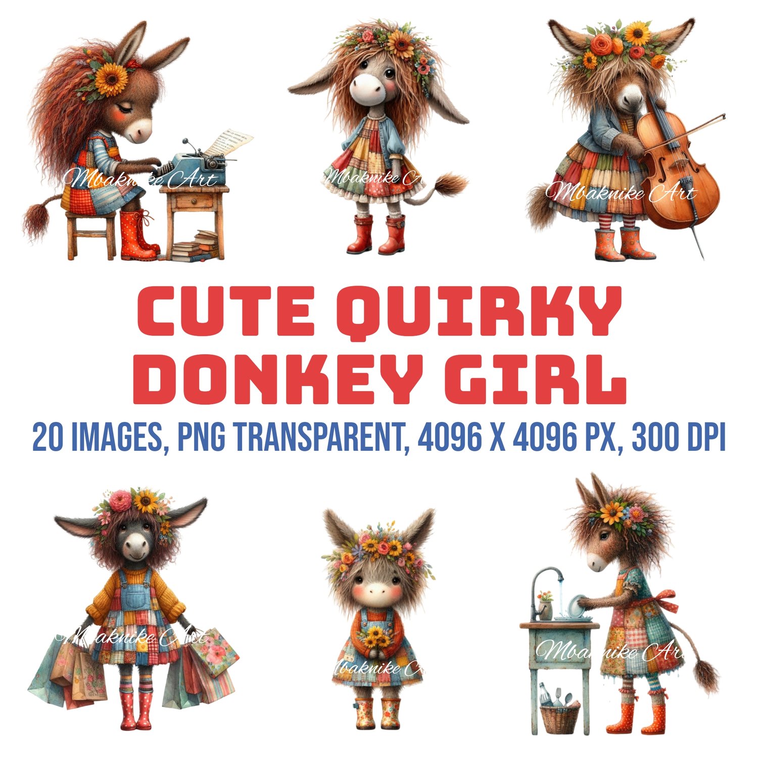 Transform your creative projects with our "Cute Quirky Donkey Girl Clipart" collection! This digital pack includes 20 unique and whimsical images, each in PNG transparent format at a high resolution of 300 dpi and 4096 x 4096 px.