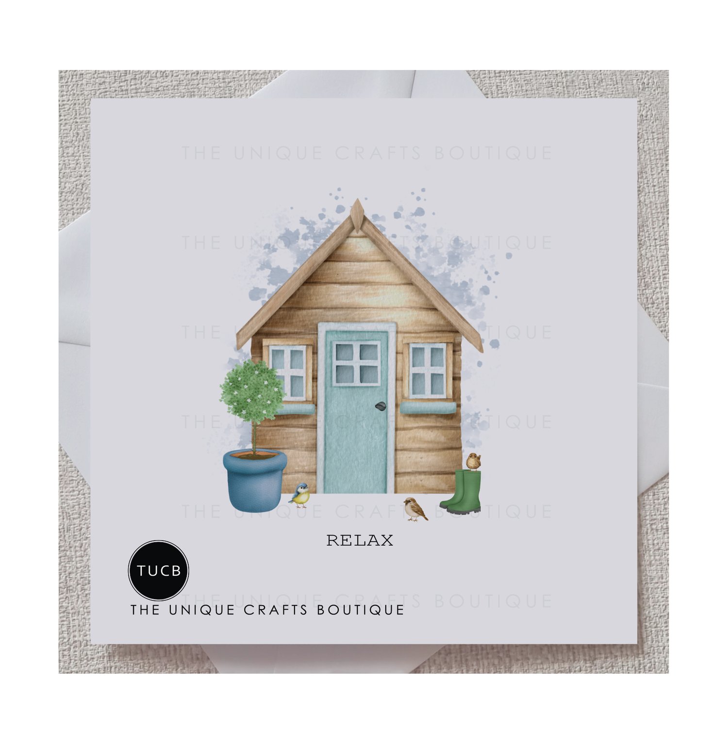 Printed with a cute little gardening shed surrounded by sweet little garden birds and displaying the message 'relax' on the front.