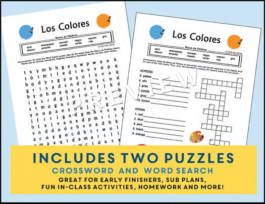 Make learning Spanish colors (los colores) exciting and interactive with this engaging 2-puzzle set! Students will reinforce key color vocabulary while having fun solving a crossword and a word search—perfect for beginner Spanish learners in elementary, middle, or high school.