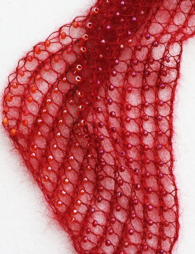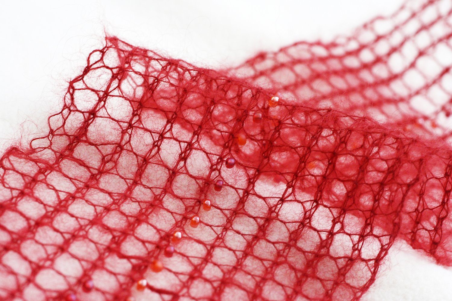 This lacey scarf, embedded with beads is an elegant addition to any wardrobe. Wrap it around your neck a couple of times and tie it at your throat for an opulent ascot or wrap it once around your neck and fling it over both shoulders. The weight of the beads holds the feather-light kid mohair in place when you wear it.