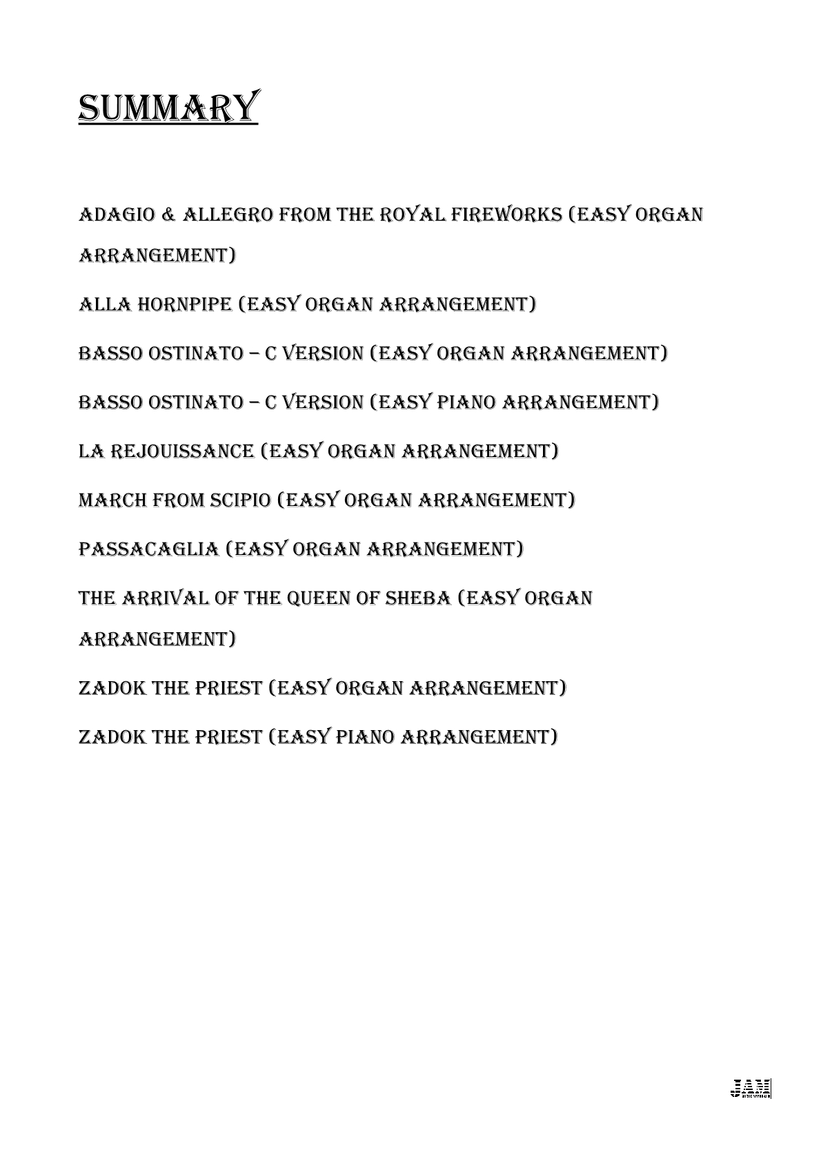 My arrangements for EASY ORGAN & PIANO OF THE BEST SONGS BY G. F. HANDEL. ARRANGED FOR ORGAN & PIANO.