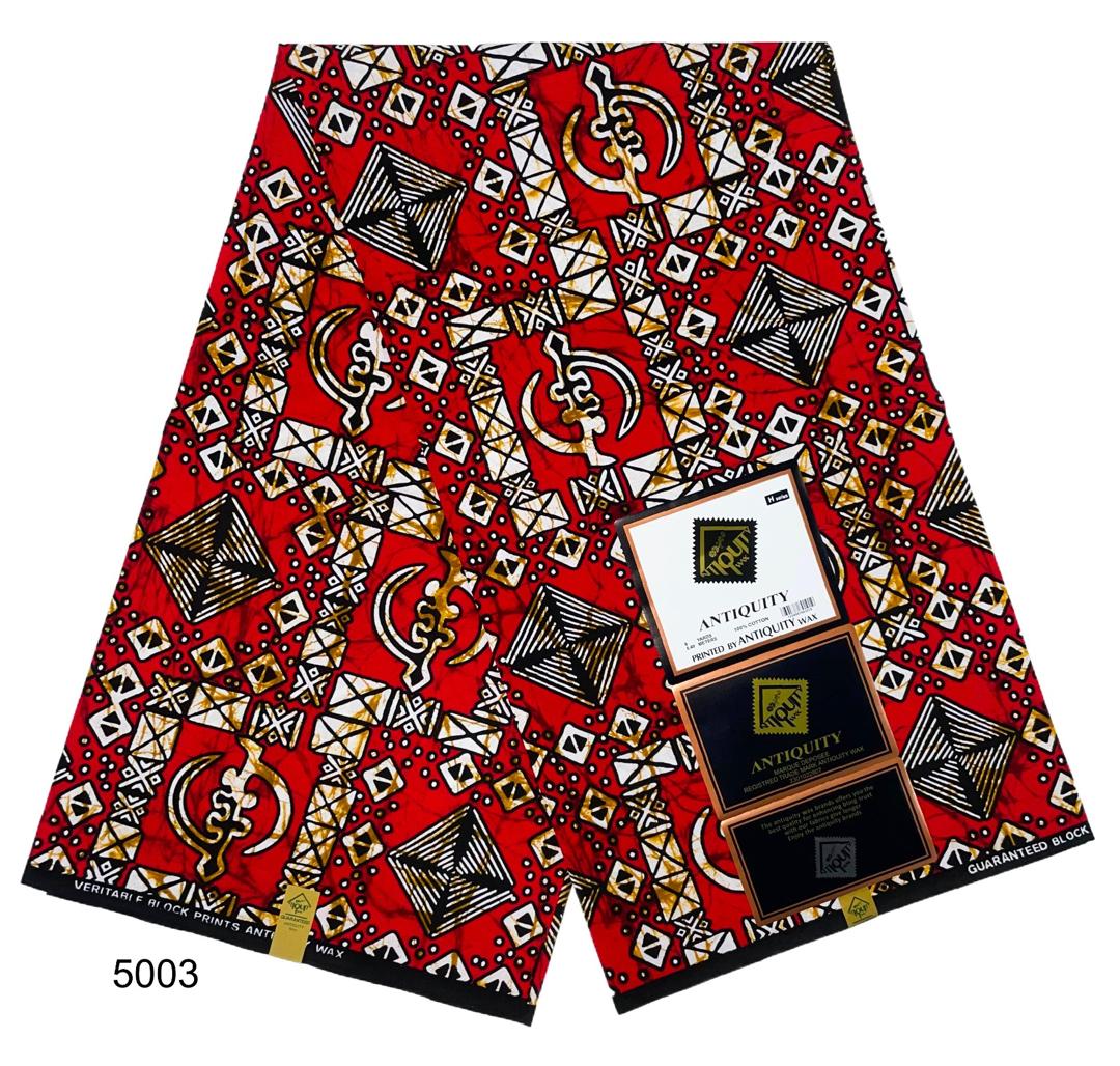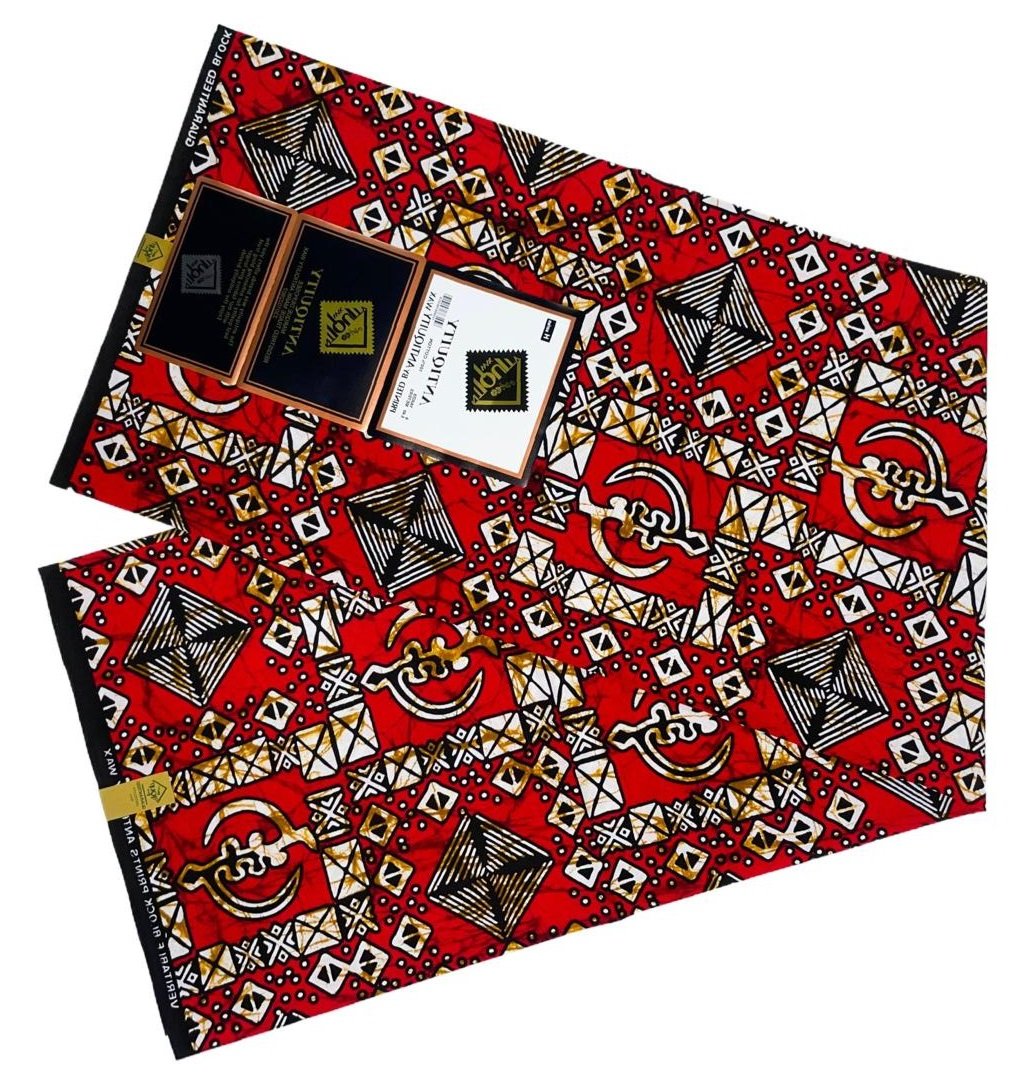 Elevate your style with this premium Antiquity Wax Print Fabric, featuring a vibrant blend of bold red, gold, black, and white. The fabric showcases intricate geometric shapes alongside traditional Adinkra-inspired symbols, making it perfect for both modern and cultural fashion designs.