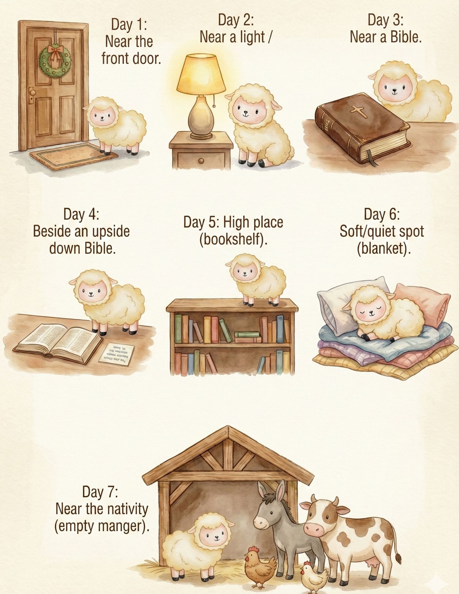 - 7‑day Christian Christmas journey with a quick‑start placement guide so you always know where to hide the lamb each day (front door, light, Bible, high place, soft spot, and near the nativity).