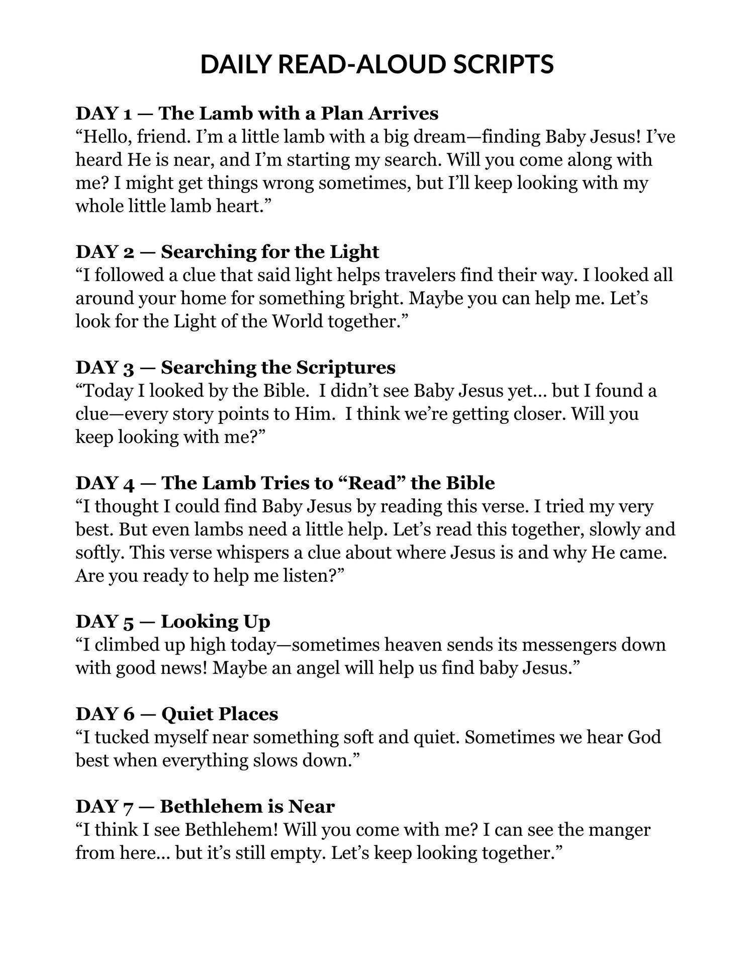 - Short, scripted read‑alouds for each day that gently point children to Jesus as the Light of the World and build anticipation as the lamb gets closer to Bethlehem.