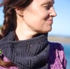 This cowl is knit seamlessly and features an easy to work lace pattern. Delicate yet durable, the lace breathes with an airy elegance that belies how simply it is constructed; a pattern that rewards beginners and satisfies the experienced knitter alike. It can be worked in three different sizes for different effects, and works up quickly at a looser tension, meaning your gift of time is never too great a sacrifice.