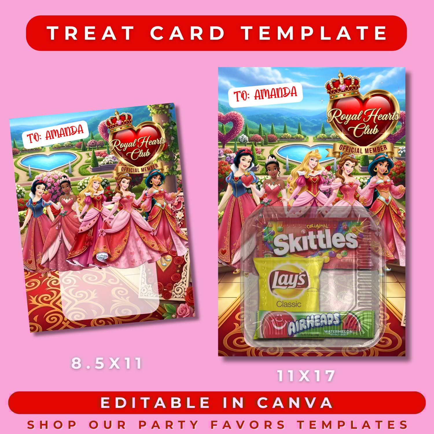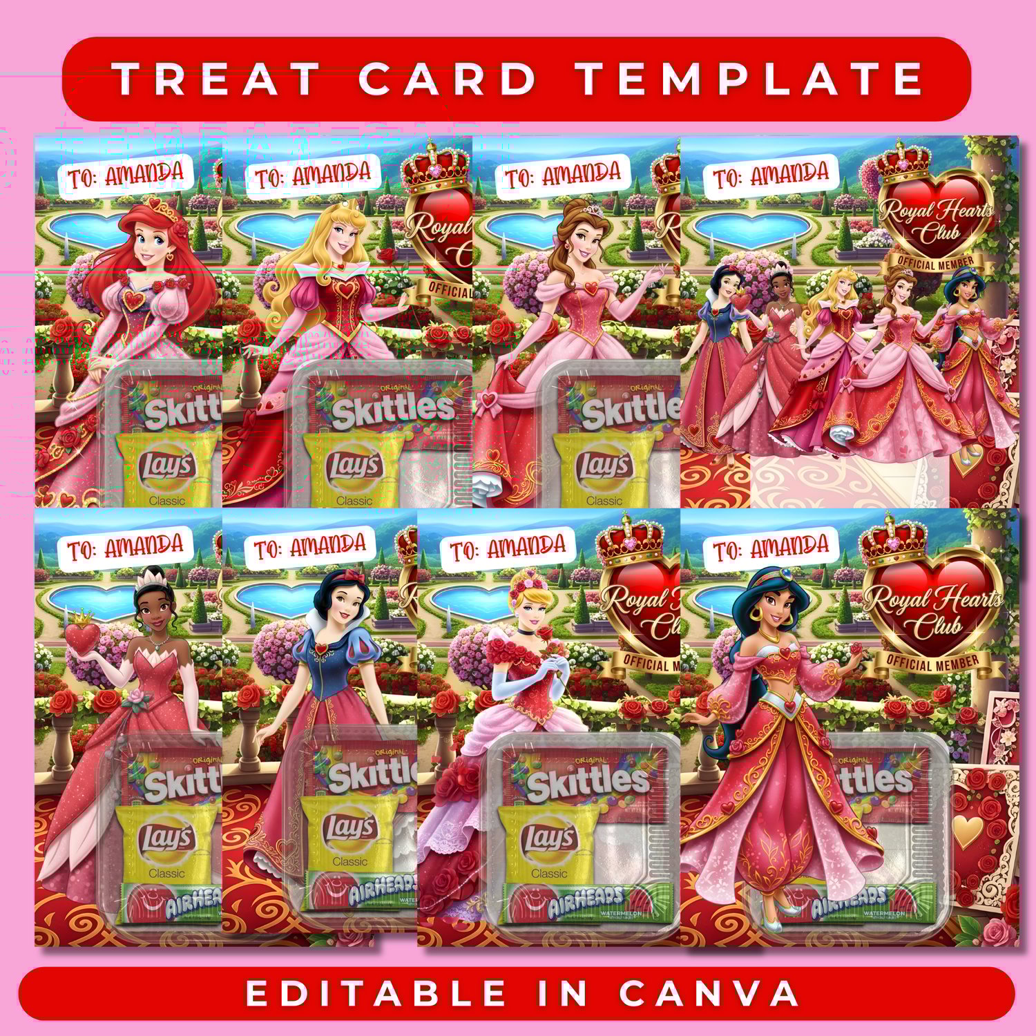 Princess Bundle Valentine Treat Card Template (Editable in Canva) Digital Download | Valentine Treat Cards | Party Favors