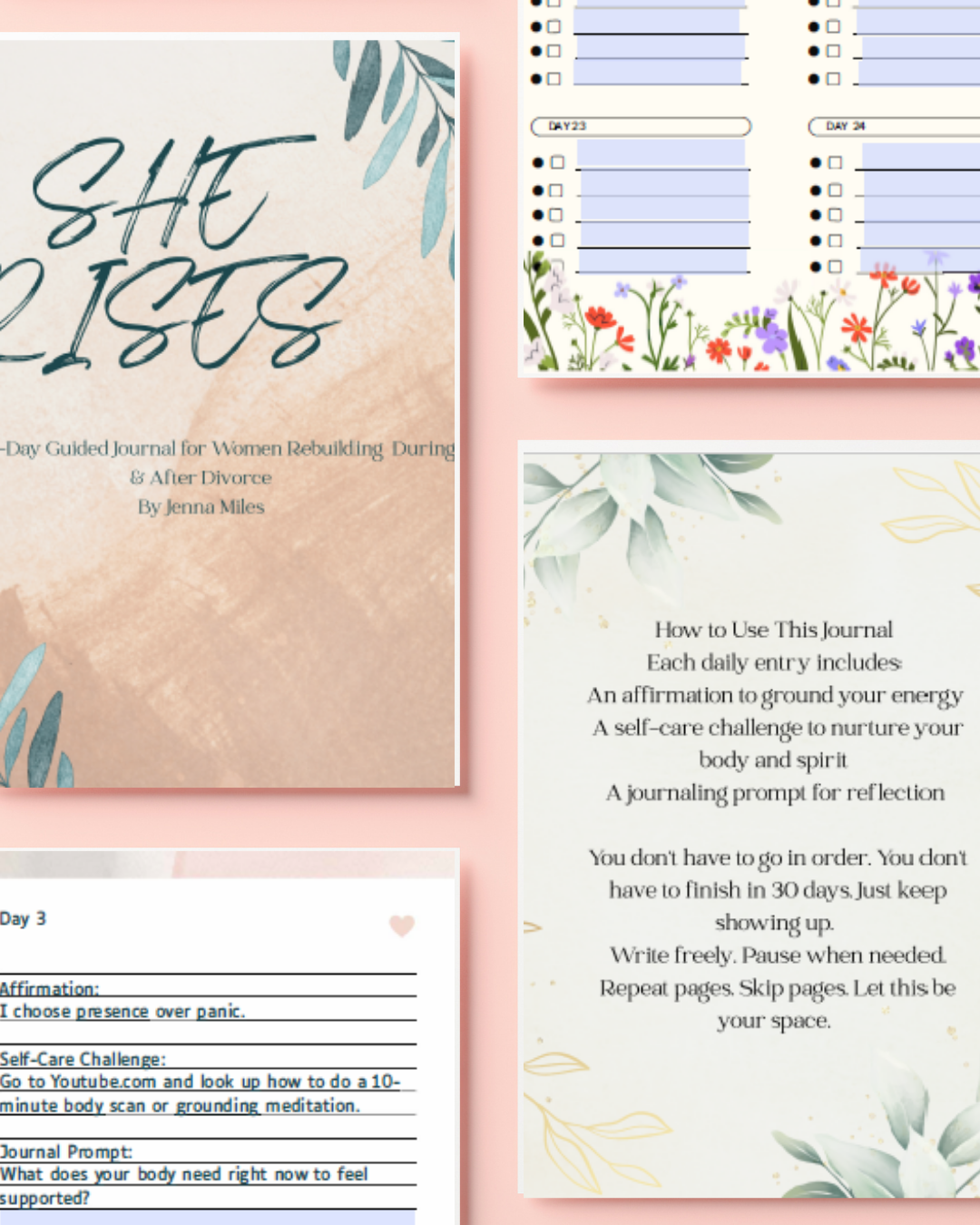 ✨ She Rises: A 30-Day Guided Journal for Women Rebuilding During & After Divorce By Jenna Miles She Rises is a powerful, heart-centered journal created for women navigating divorce, heartbreak, and emotional healing. Whether you’re in the middle of a sep