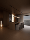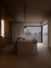 Timberlight is a minimalist kitchen/dining concept featuring soft wood finishes, ambient backlighting, and refined material details. The scene captures a warm, tranquil atmosphere perfect for showcasing lighting, materials, and spatial harmony in any visual portfolio or client presentation.