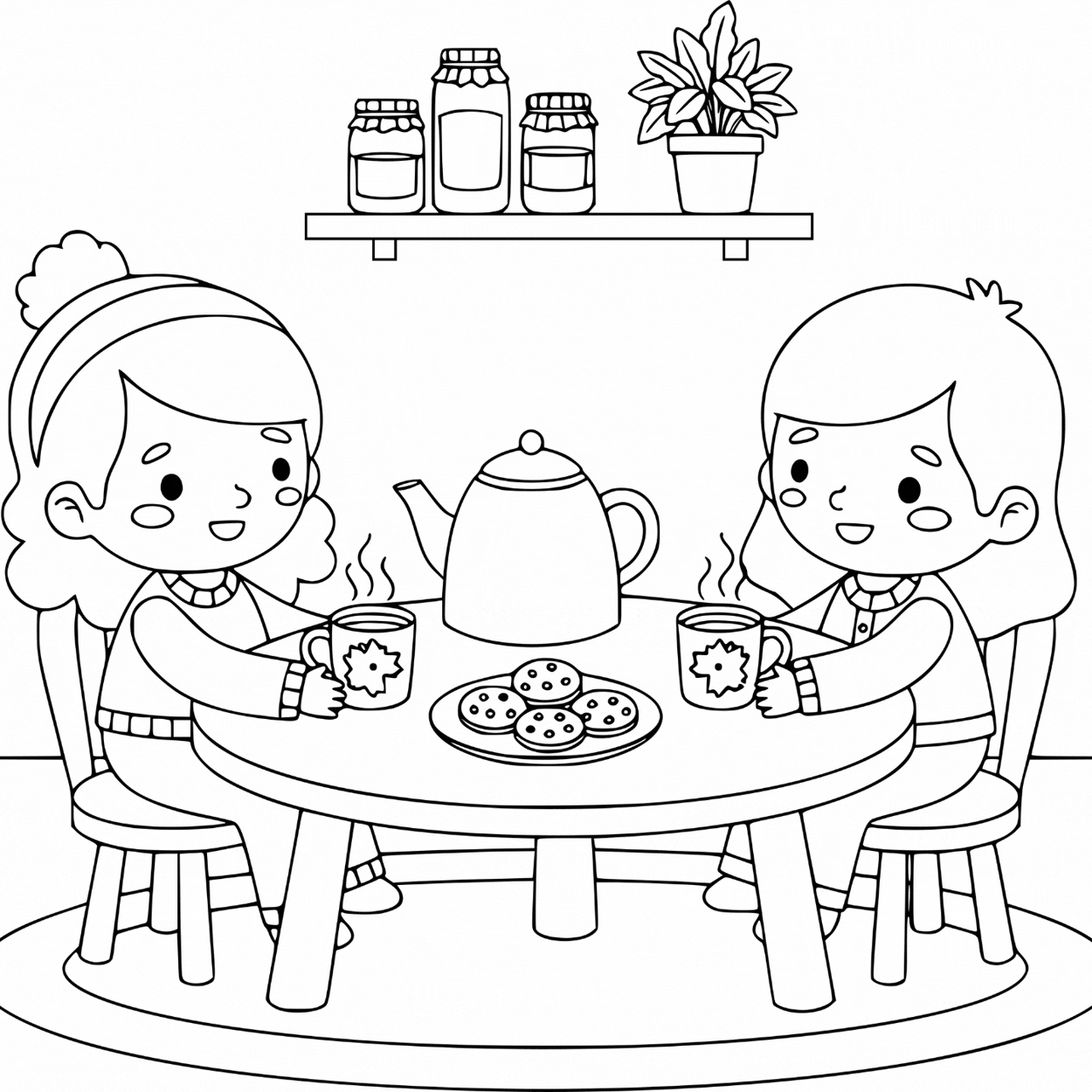 Each page features a warm hygge‑inspired scene: comfy living rooms, reading nooks, tea time, knitting corners, journaling spots, indoor plants, gentle stretching, baking days, winter walks and more. The artwork is drawn in a cute, simple cartoon style with clean outlines and large open spaces, perfect for easy, stress‑free coloring.