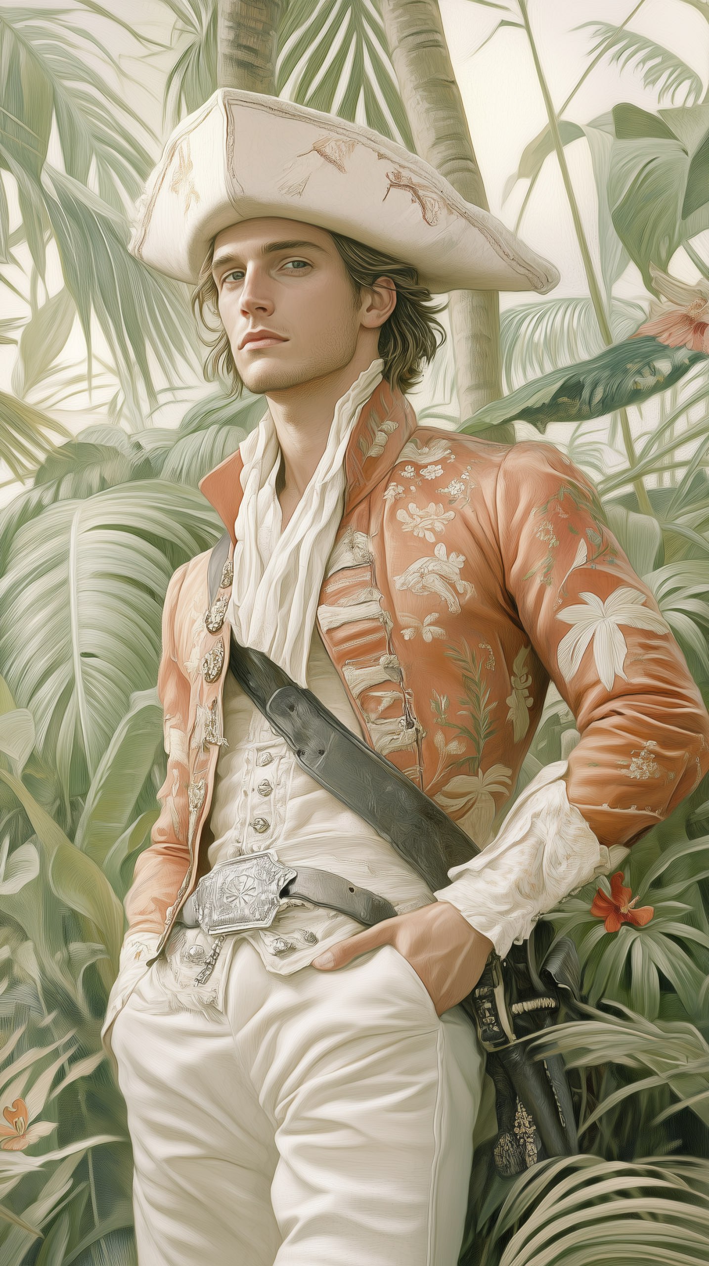 Step into a vivid tropical world with a young pirate captured in a moment of calm amidst lush Caribbean jungle scenery. Surrounded by vibrant greenery, towering palms, and exotic flowers, the detailed costume and natural setting create a stunning contrast with a harmonious visual flow. The scene delivers a unique blend of adventure and tranquility, offering a cinematic yet grounded perspective of pirate life. Perfect for creators seeking detailed, professional, and visually captivating imagery with a fresh, story-driven atmosphere.