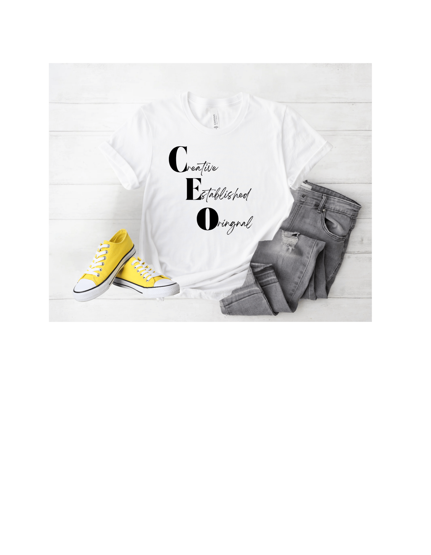 "CEO White and Black” Graphic Tee – Make a bold statement with this white and black short-sleeve crewneck. Crafted from 100% heavyweight preshrunk cotton, this durable tee is designed for comfort, style, and motivation you can wear every day.