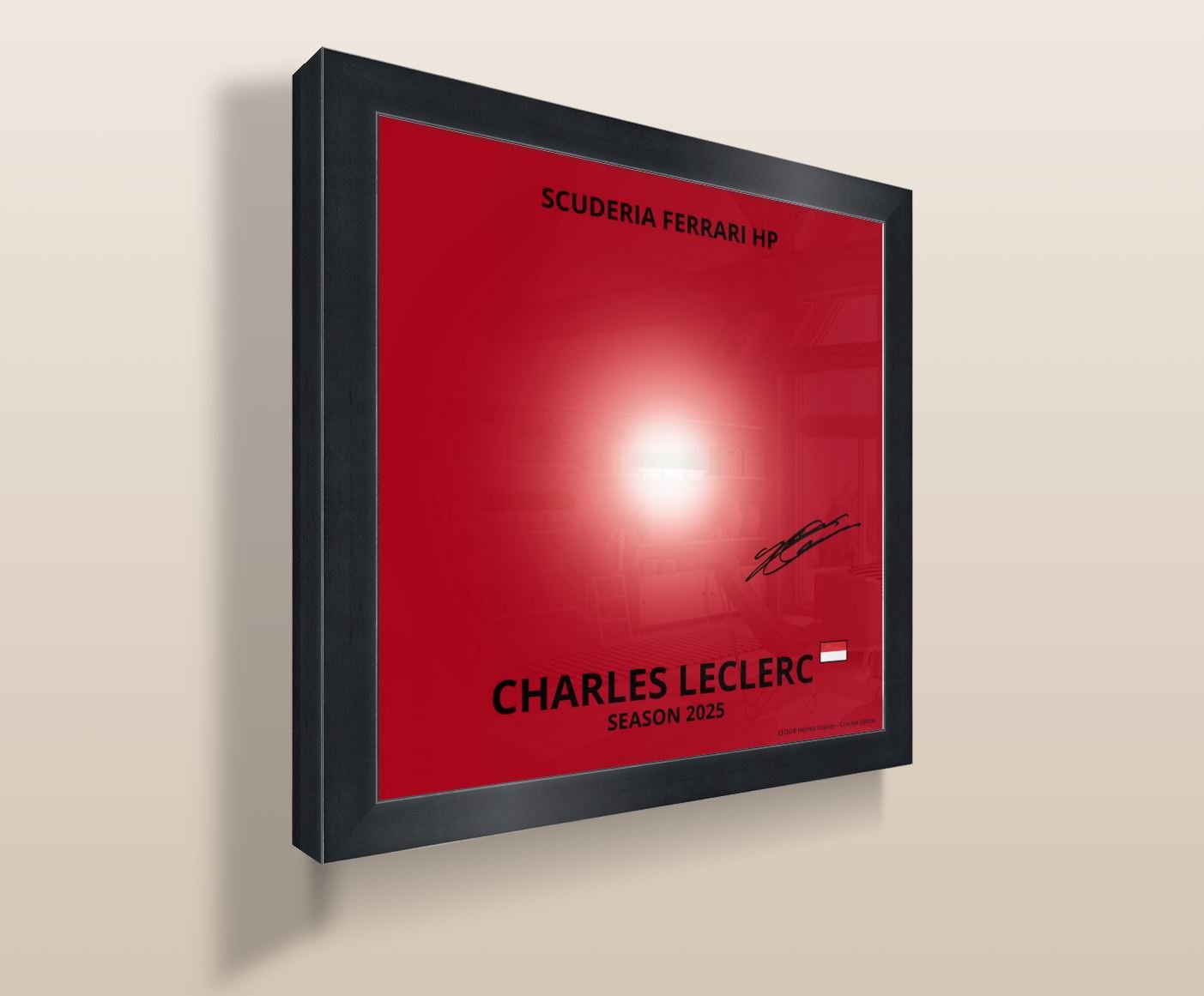 Digital poster compatible with LEGO® Icons Scuderia Ferrari HP Charles Leclerc Helmet #43014, designed to enhance your Formula 1 display with a clean and modern motorsport aesthetic.