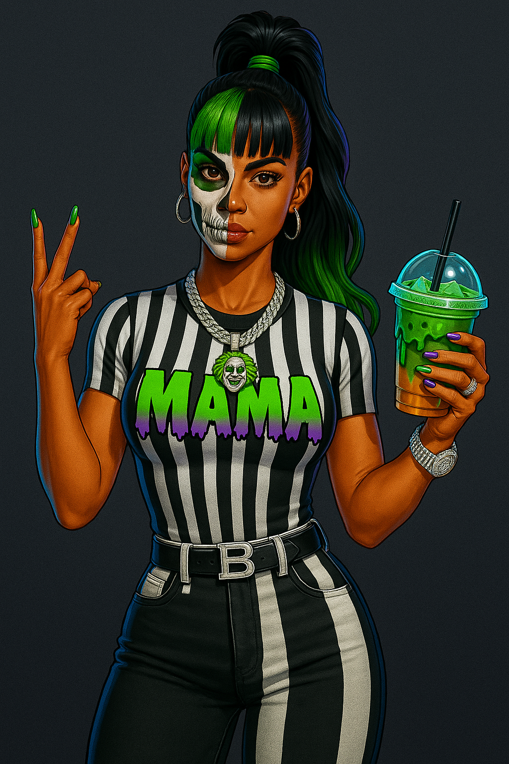 - Mama Beetlejuice PNG π β Bold Beetlejuice-inspired mom in black & white stripes, neon green + purple accents, with iced-out jewelry.