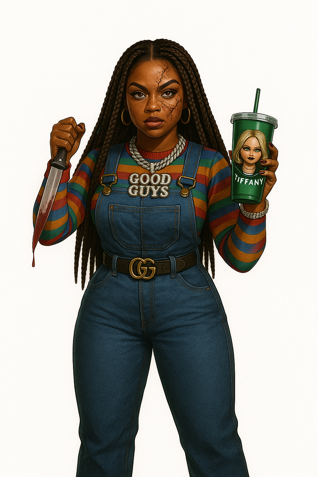 - Mama Chucky PNG πͺ β Chucky-inspired mom in Good Guys overalls, rocking braids, knife in hand, and Tiffany tumbler.