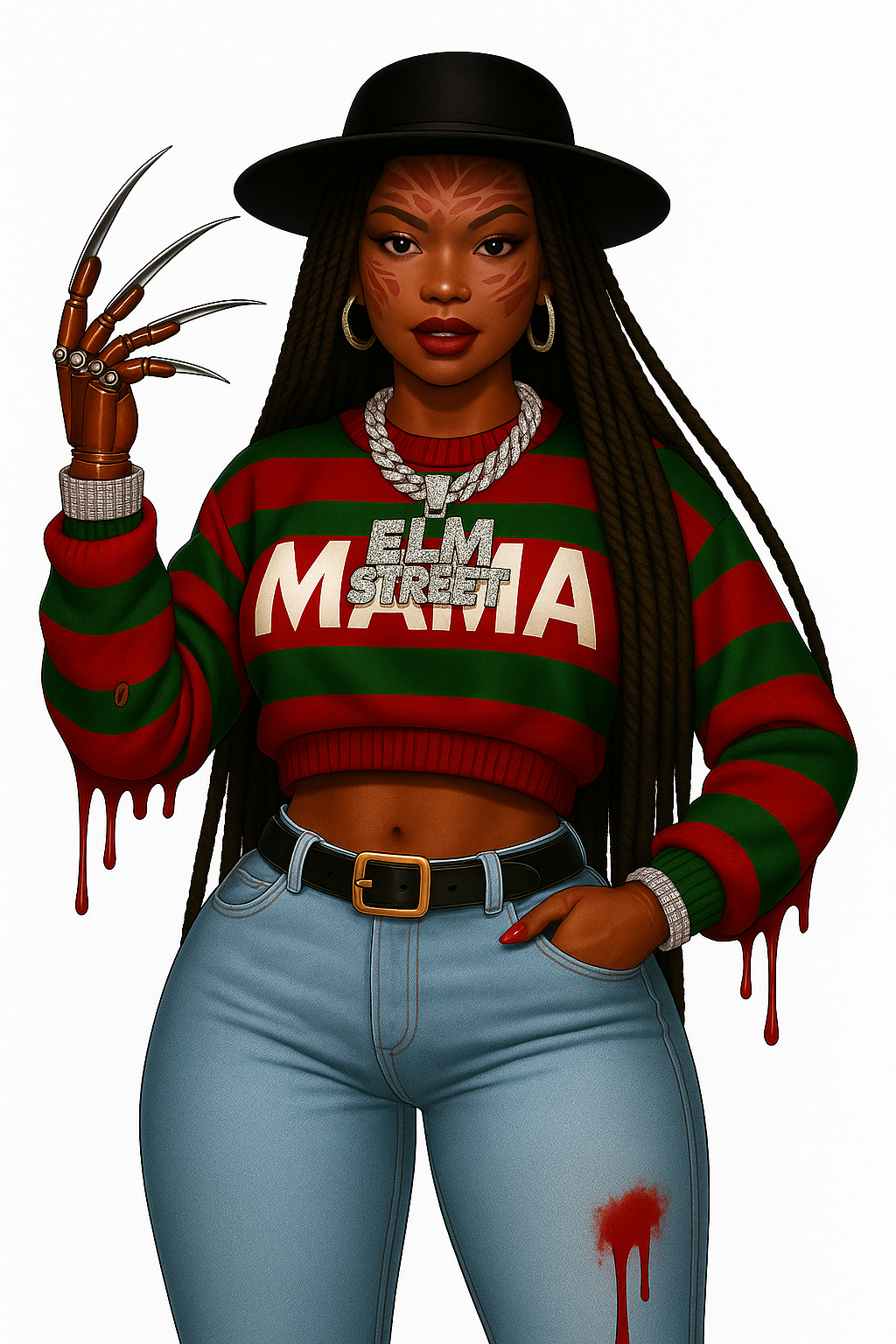 - Mama Freddy PNG π©Έ β Freddy Krueger inspired mom with caramel skin tone, Elm Street iced-out necklace, and claw glove.