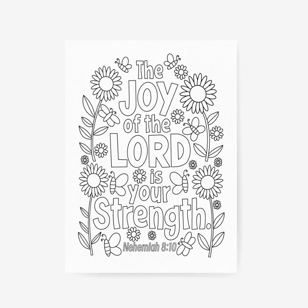 This coloring page highlights the verse Nehemiah 8:10: "The joy of the Lord is your strength."