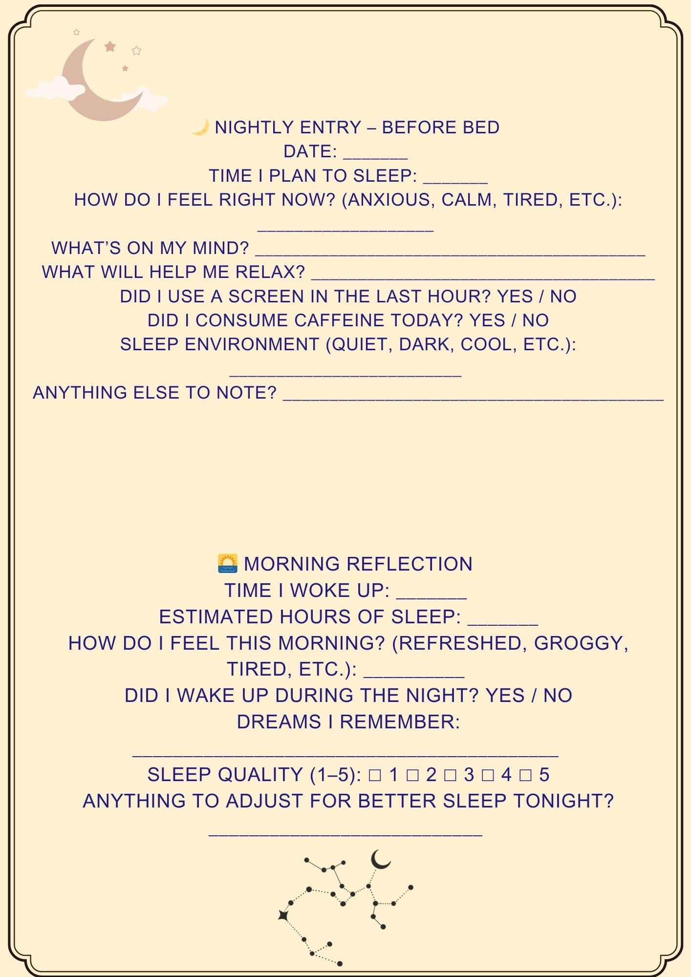 #sleepjournal #sleeptracker #printablesleeplog #bedtimeroutine #mindfulnessjournal #wellnesstracker #selfcarejournal #emotionalclarity #guidedprompts #morningreflection #beforebedjournal #digitalsleepdiary #nightroutineplanner #sleephygiene #mentalhealthjournal #relaxationtracker #dreamjournal #sleeplogforadults #resttracker