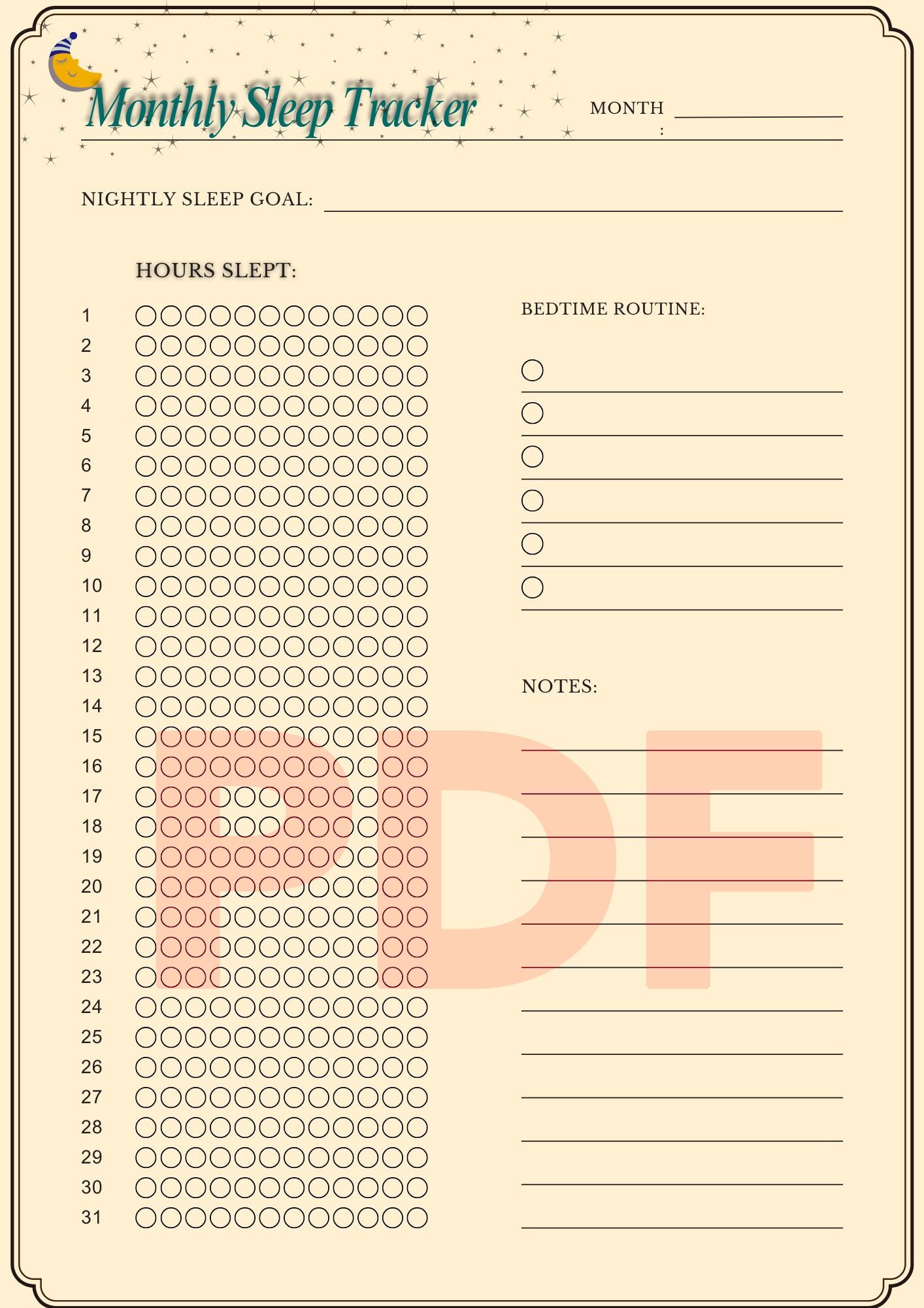 βοΈ 1 x Monthly Sleep Tracker (track 31 days with hourly dots)