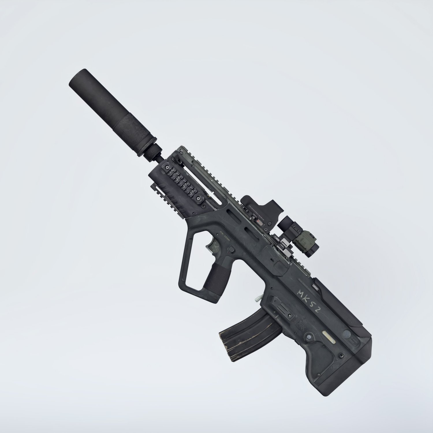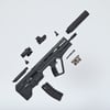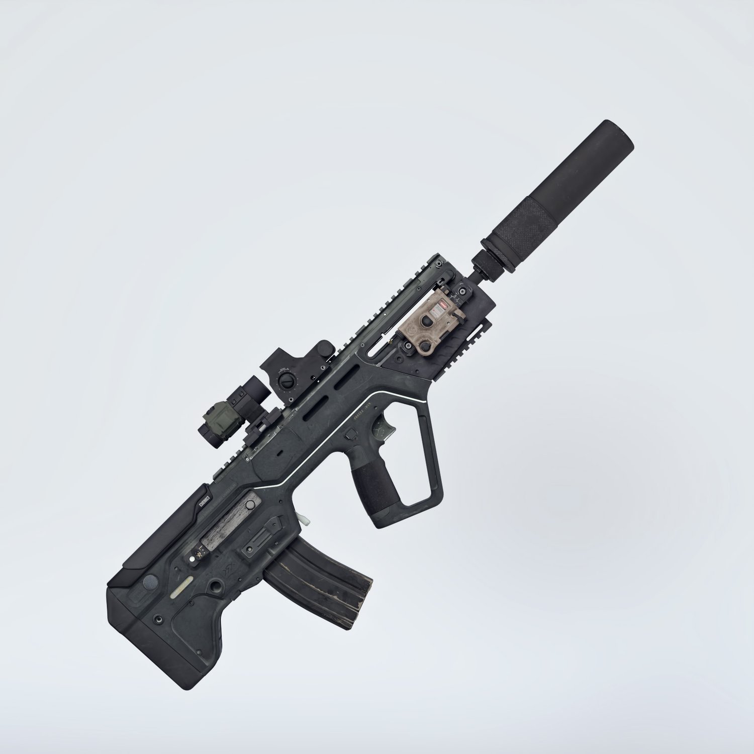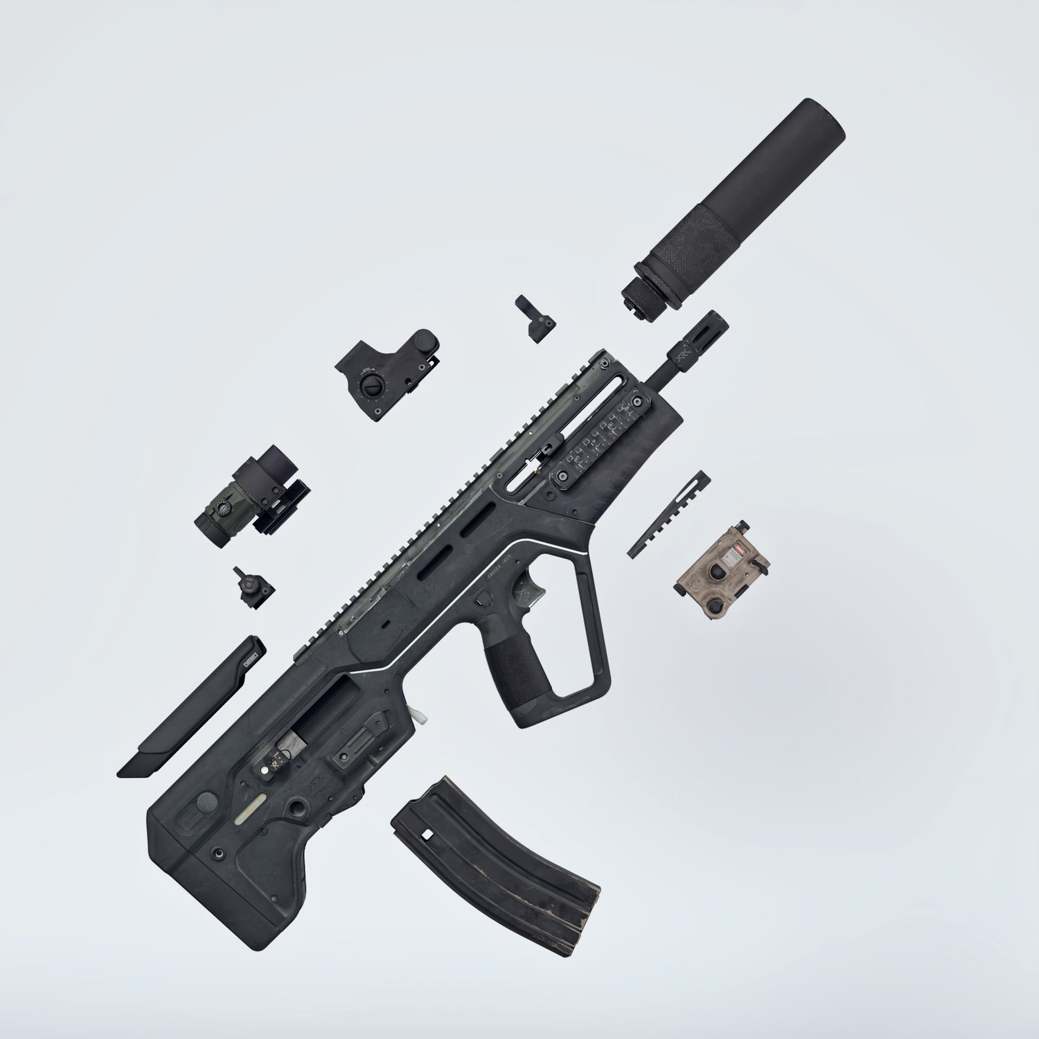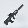 A cool bullpup assault rifle, one of the few that are still in active military service. Considered one of the best of its kind, designed as a bullpup configuration from the beginning. Picatini rails, sights, compact size. Includes a red dot with a magnifier, a silencer, a laser and iron sights for covert operation. Converted and rigged for use in DAZ. Trigger, safety, bolt, mag etc also rigged for more realistic pictures.