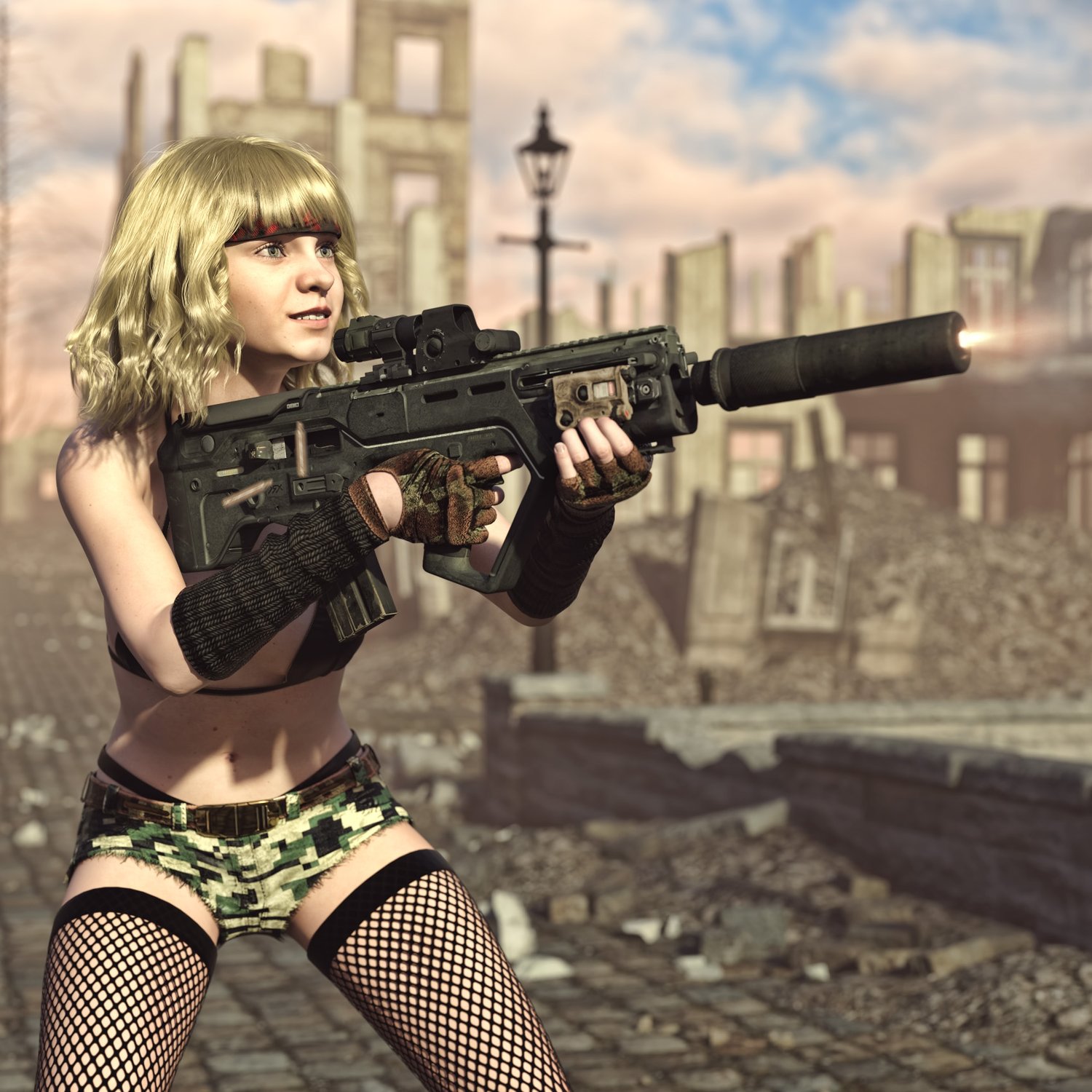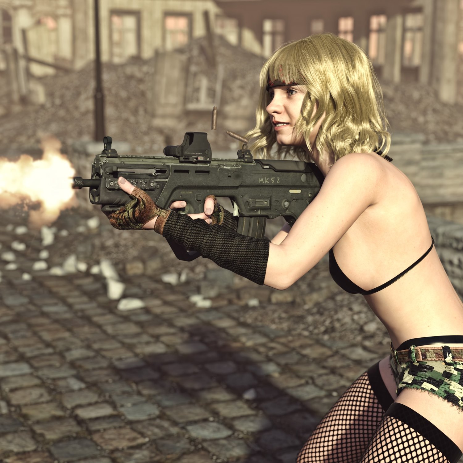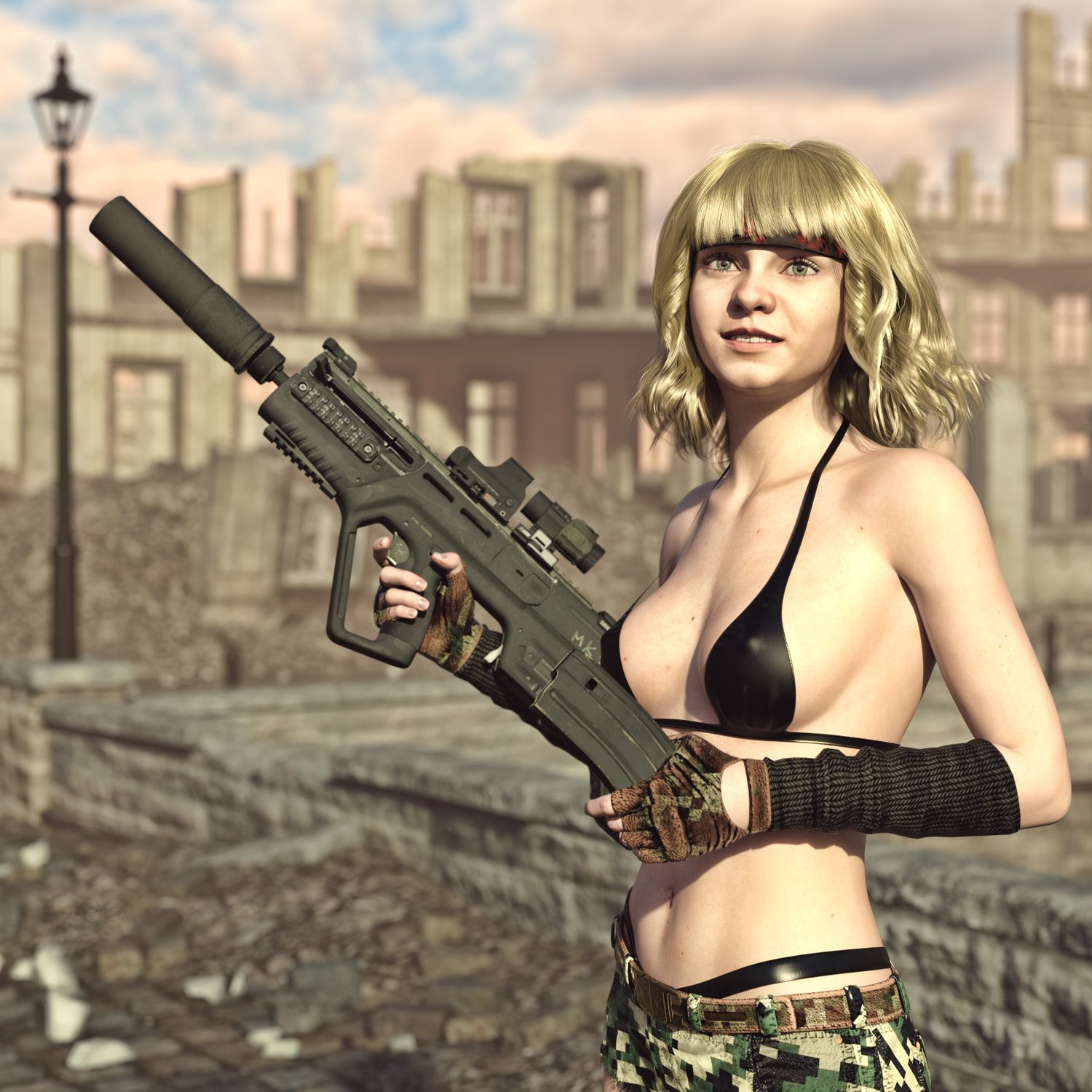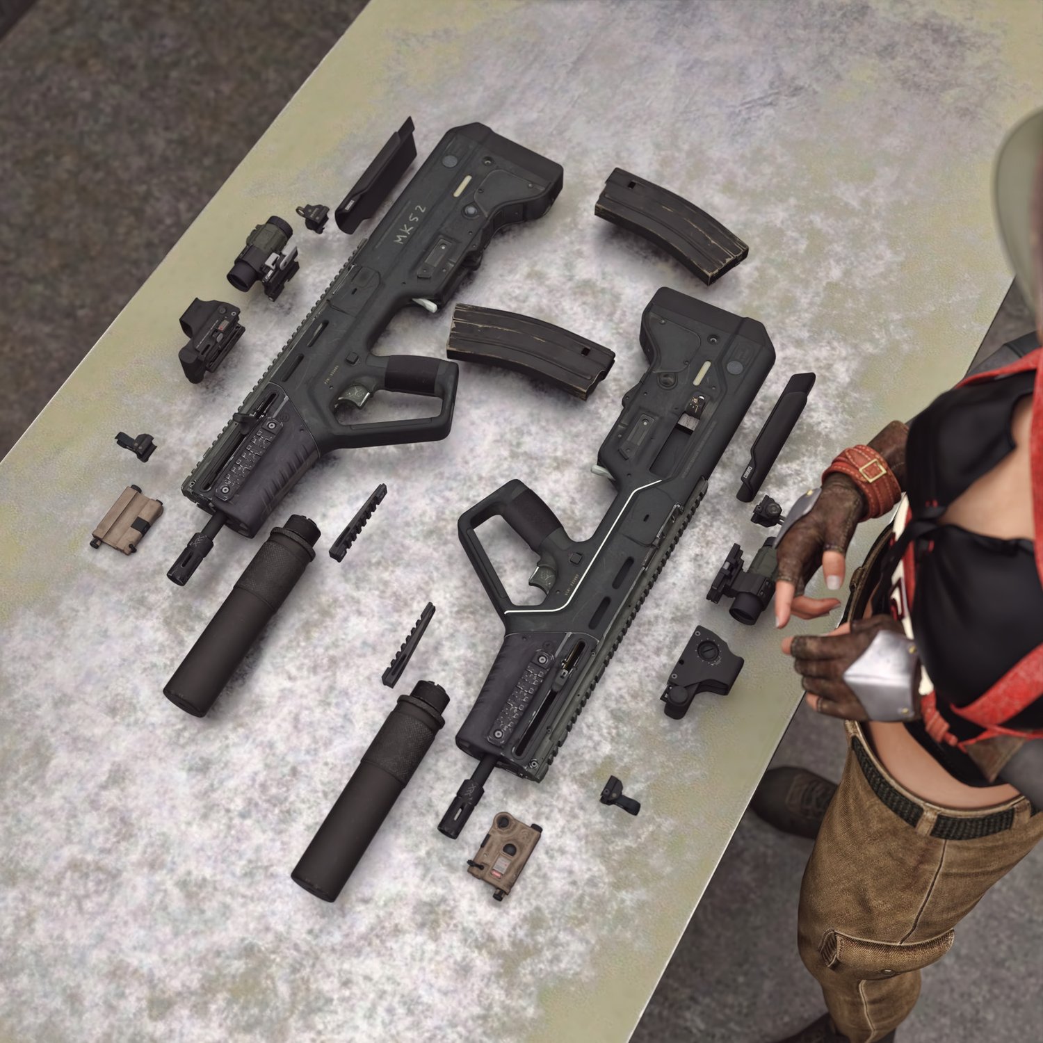 A cool bullpup assault rifle, one of the few that are still in active military service. Considered one of the best of its kind, designed as a bullpup configuration from the beginning. Picatini rails, sights, compact size. Includes a red dot with a magnifier, a silencer, a laser and iron sights for covert operation. Converted and rigged for use in DAZ. Trigger, safety, bolt, mag etc also rigged for more realistic pictures.