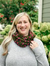 To achieve this look, use one skein of assigned pooling yarn and one skein of a coordinating tonal. Note: This sample is shorter than directions provided in the pattern. But if you like a long infinity scarf (over 60 in) you will need two skeins of assigned pooling yarn. The length of the finished cowl varies based on the length of the assigned pooling color in the yarn. If you choose this option, I suggest buying two skeins of the assigned pooling just in case.