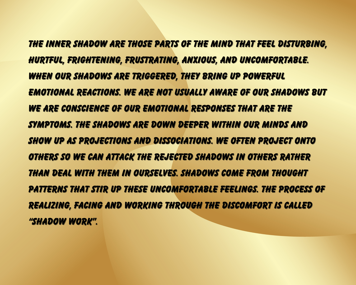 The inner shadow are those parts of the mind that feel disturbing, hurtful, frightening, frustrating, anxious, and uncomfortable. When our shadows are triggered, they bring up powerful emotional reactions. We are not usually aware of our shadows but we are conscience of our emotional responses that are the symptoms. The shadows are down deeper within our minds and show up as projections and dissociations. We often project onto others so we can attack the rejected shadows in others rather than deal with them in ourselves. Shadows come from thought patterns that stir up these uncomfortable feelings. The process of realizing, facing and working through the discomfort is called “shadow work”.