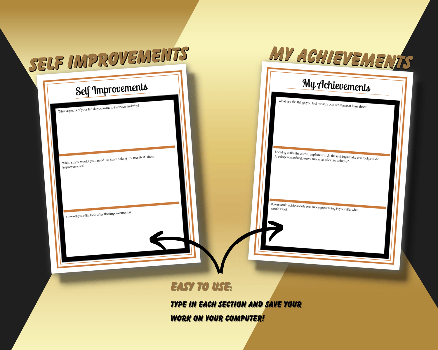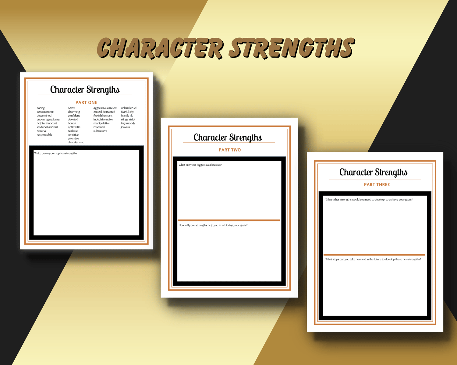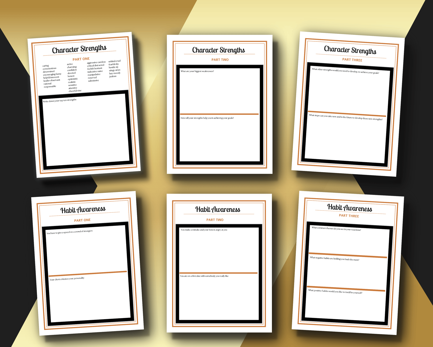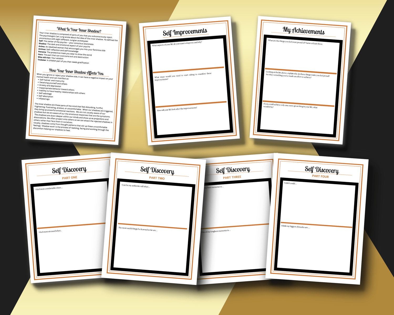 Your inner shadow is composed of parts of you that you subconsciously reject. When you ignore or reject your inner shadow, it can have a negative impact on your mental health and can manifest as: Self-hatred and insecurity Deceiving yourself and others Anxiety and depression Inappropriate behavior toward others Inability to have healthy relationships with others Self-sabotage •. Self-absorption Inflated ego Inside You Will Find: Self-Discovery Parts 1-4 My Achievements Self-Improvements Habit Awareness Parts 1-3 Character Strengths Parts 1-3
