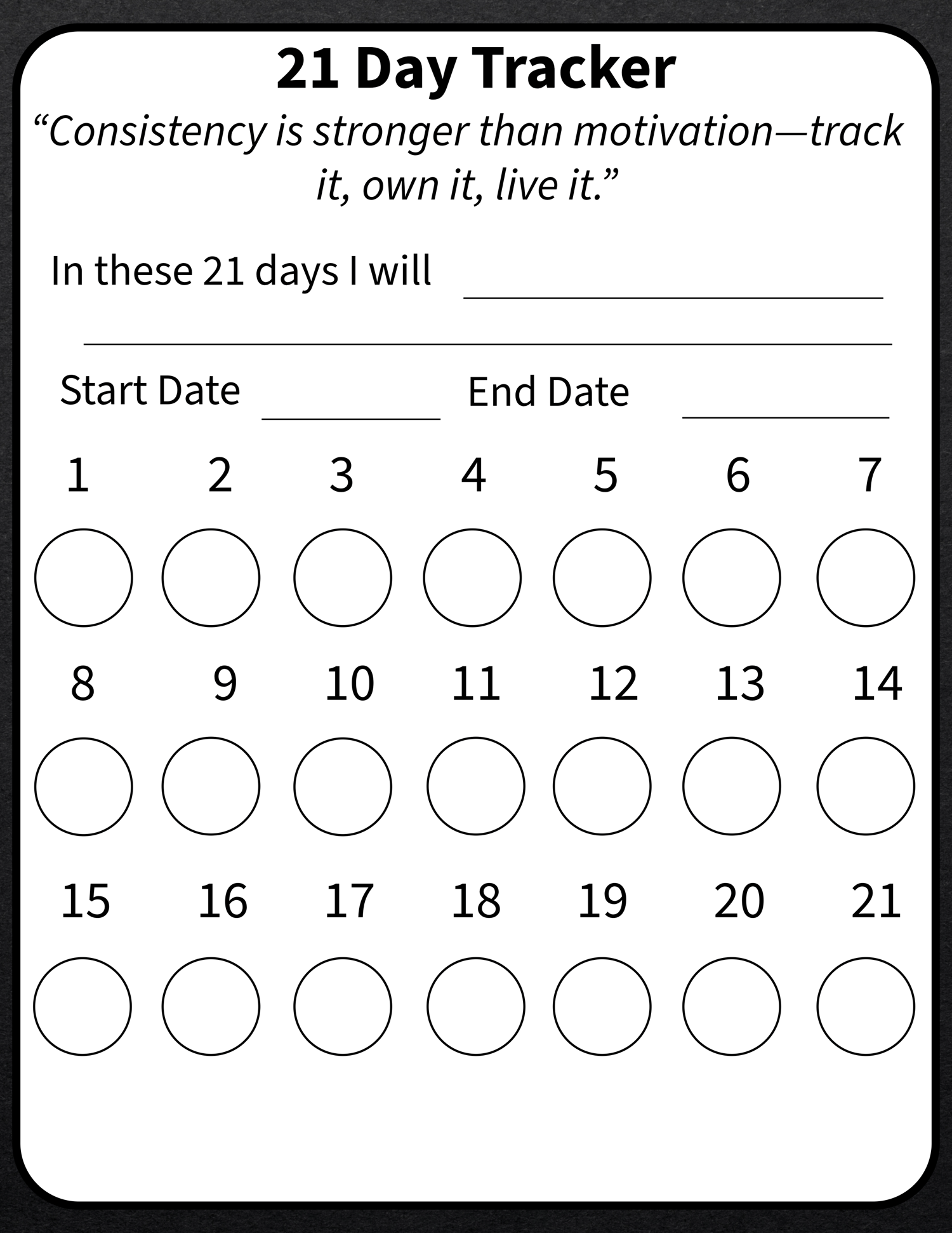Ready to create lasting habits and stay motivated? This 21 Day Tracker is designed to keep you consistent, inspired, and on track with your goals.