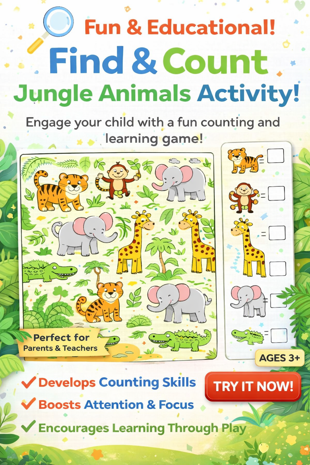 Find and count worksheet |Jungle Activity for kids | Preschool & Kindergarden PDF.