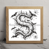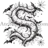 The letter S coloring book halloween occupying 90% of a 1024x1024 image. Use an Old English font style with clear outlines resembling a coloring book page. The character is composed of intricate bat silhouettes, creating a spooky Halloween atmosphere. Use only pure black (#000000) for the character and outlines, and white for the background.2D, black and white style resembling a high-quality adult coloring book page.