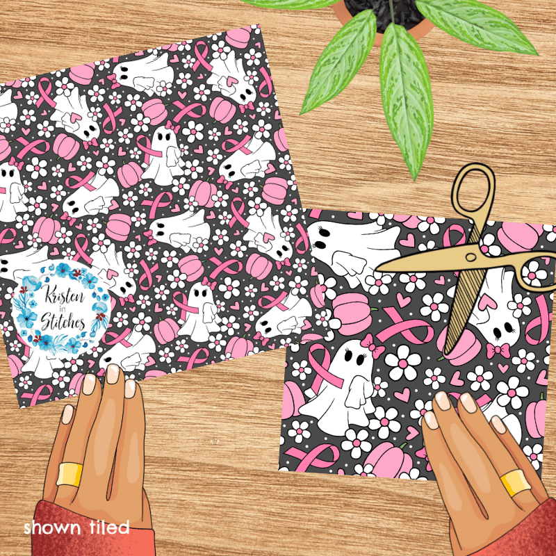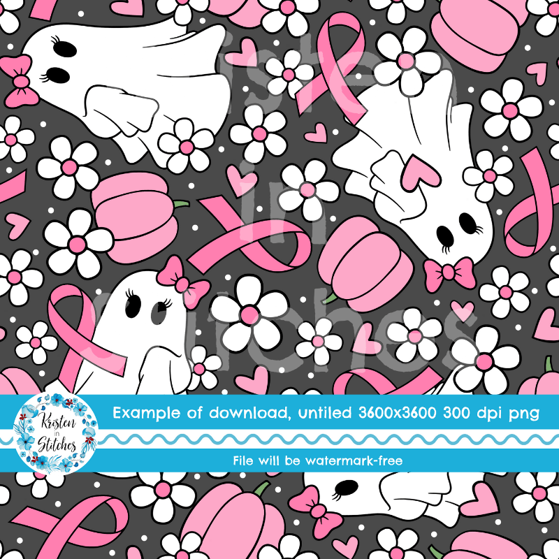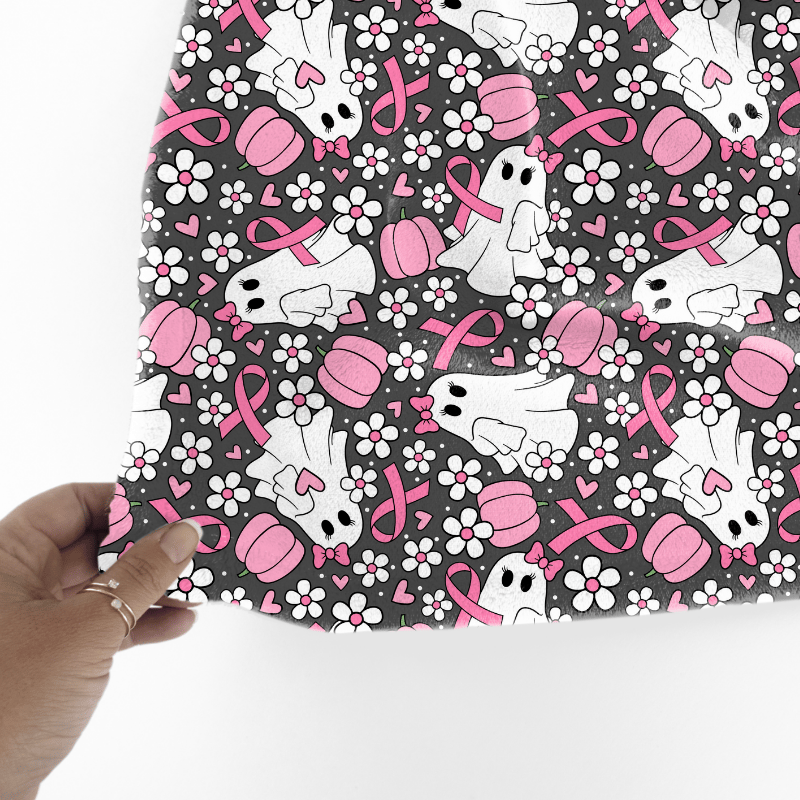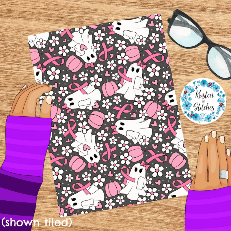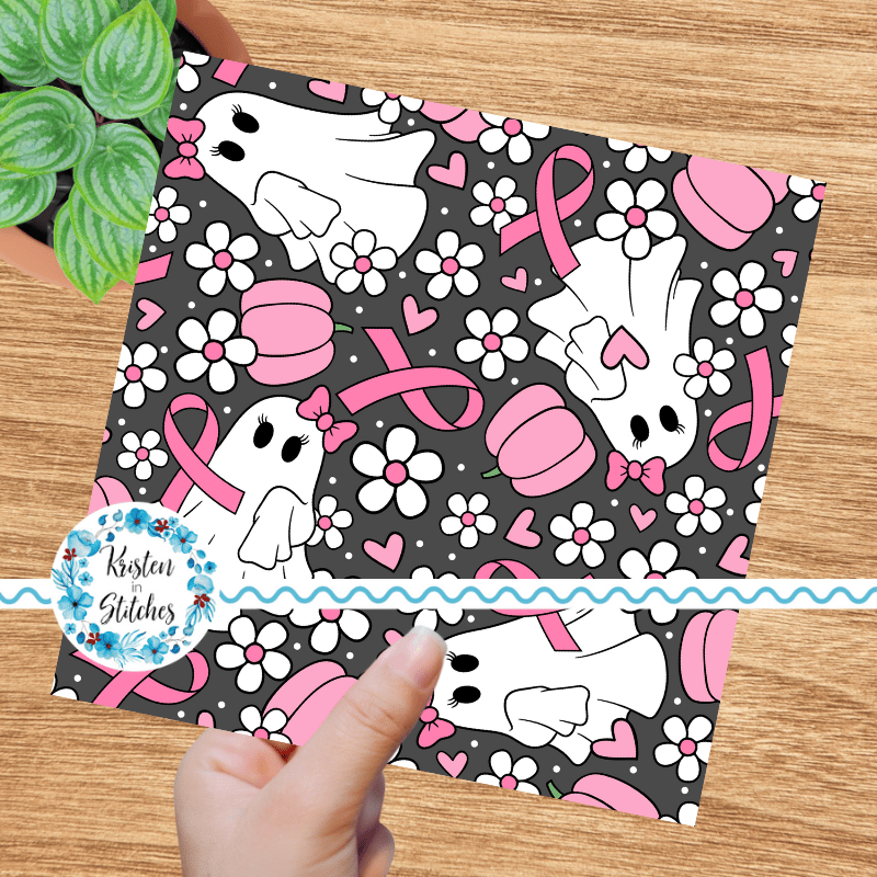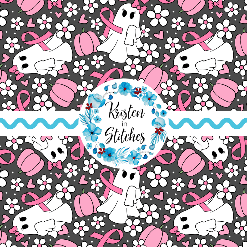 In October we wear pink. White ghosts with pink bows, daisy flowers, pumpkins and breast cancer awareness ribbons.