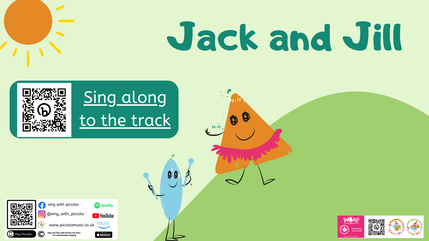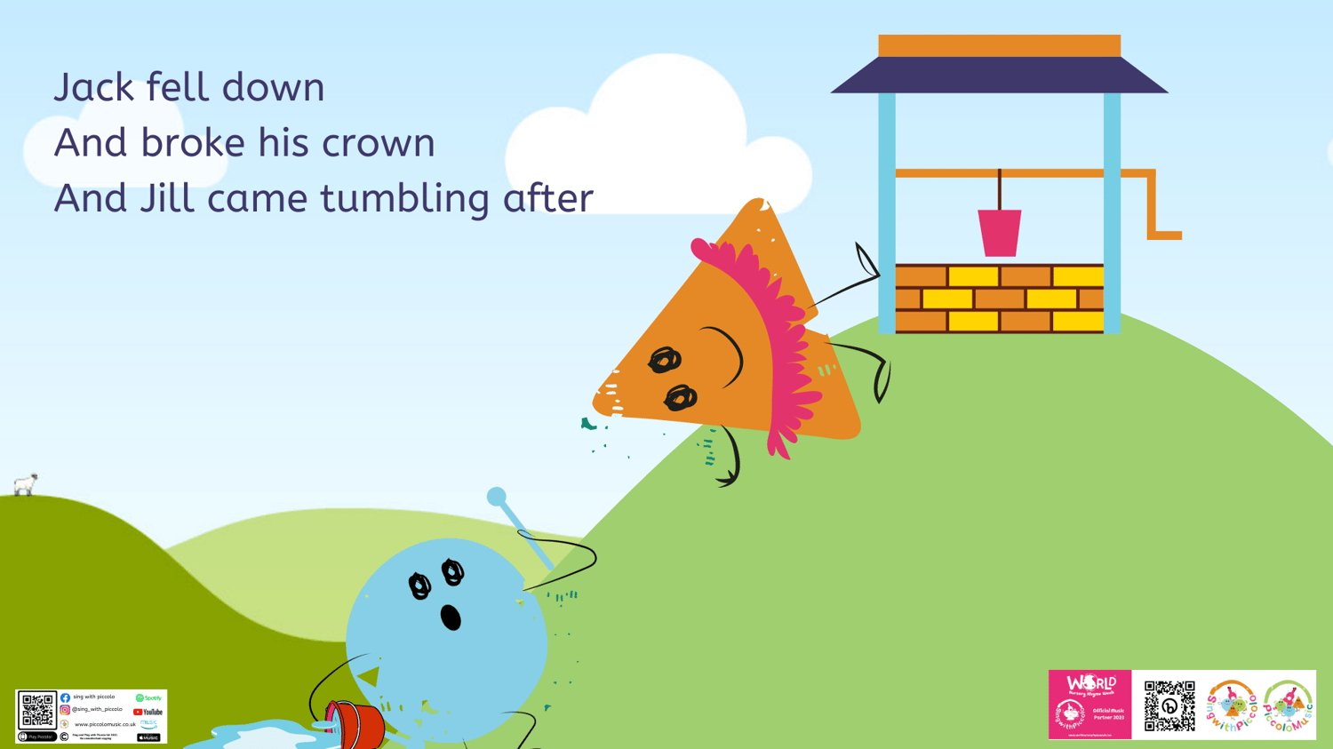 Download Piccolo's illustrated lyrics sheets for 'Jack and Jill' one of the featured rhymes for World Nursery Rhyme Week 2023. The lyric sheets are great for singing along too on a whiteboard or to use as print outs in class!