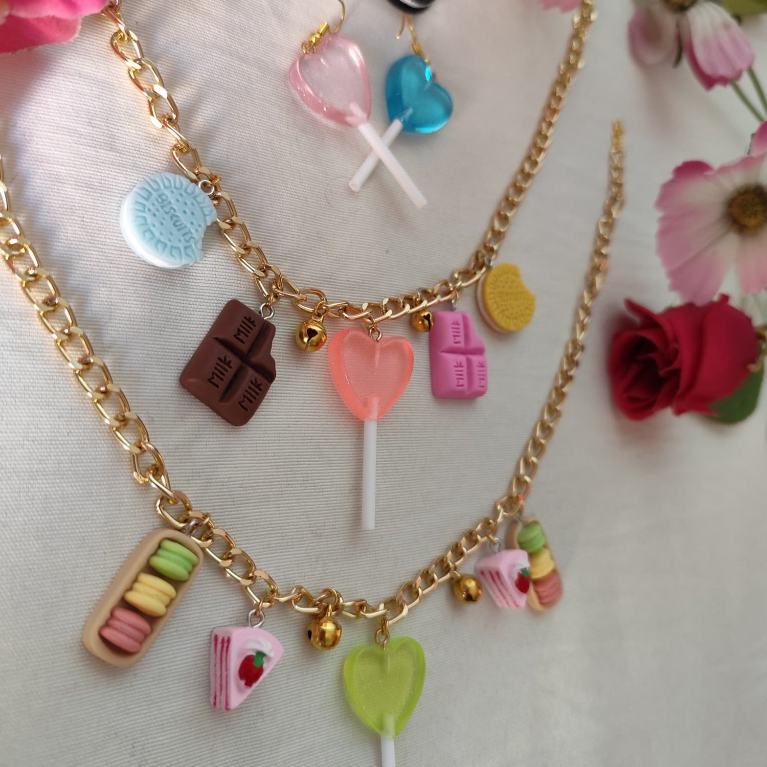 Un dulce capricho en forma de accesorio: este collar goloso combina mini tartitas, macarons y una brillante piruleta en forma de corazón, adornado con pequeños cascabeles dorados que tintinean con cada movimiento. Ideal para quienes aman los detalles divertidos, coloridos y llenos de fantasía.
