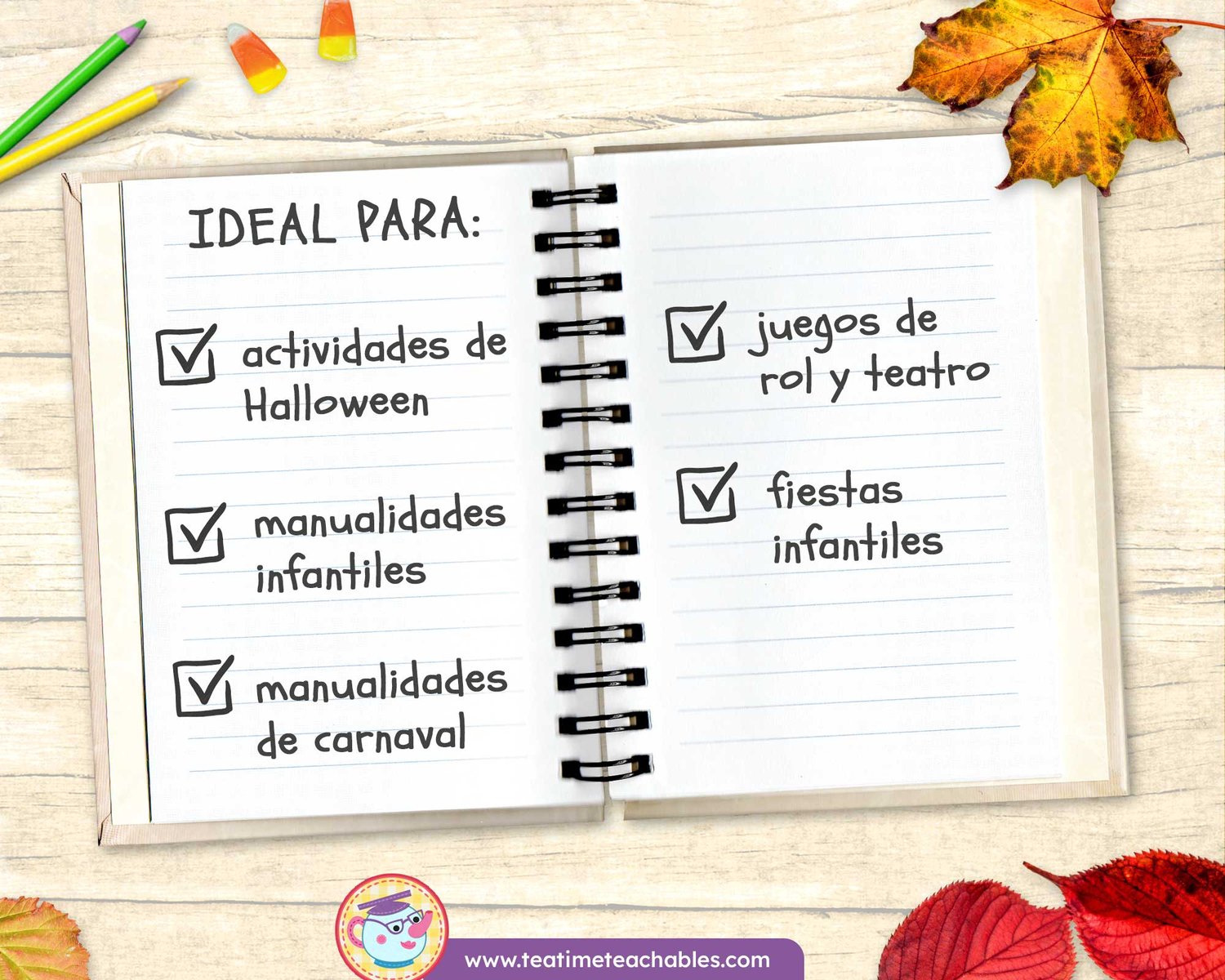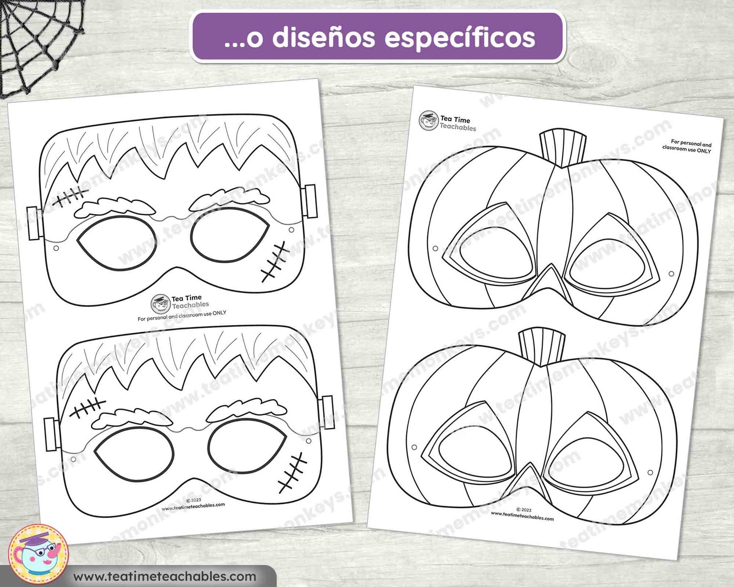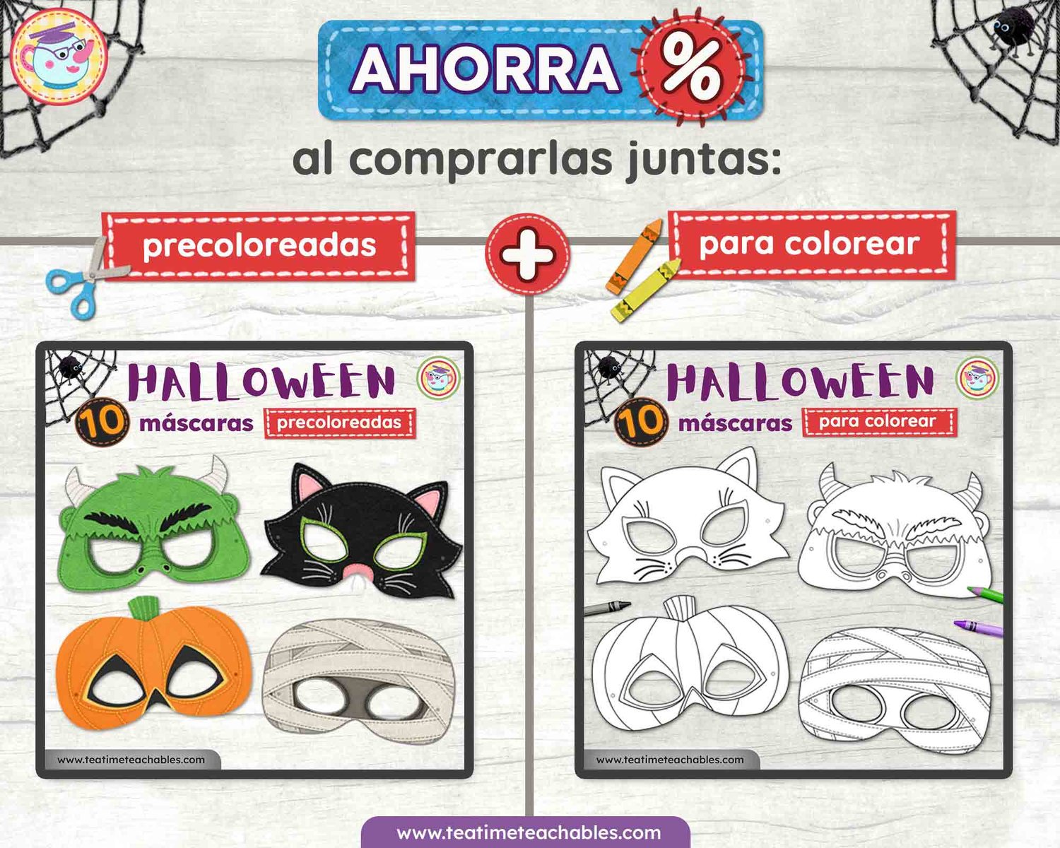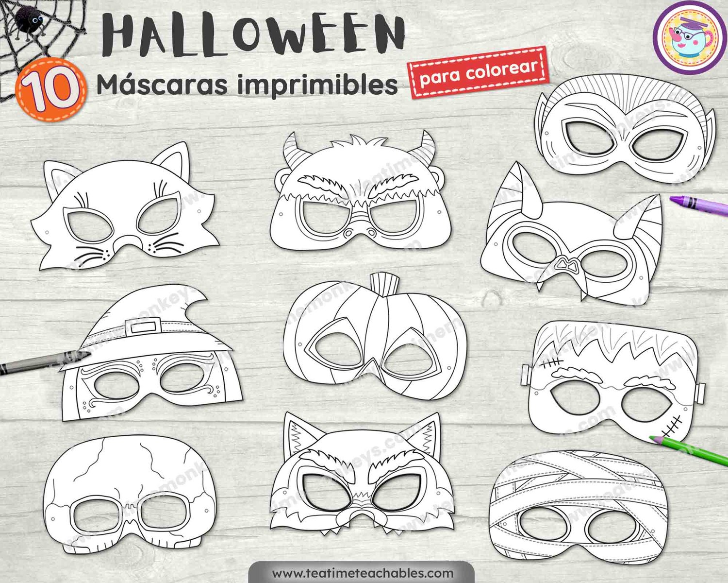 Este pack incluye DIEZ máscaras de diferentes personajes de Halloween en color: