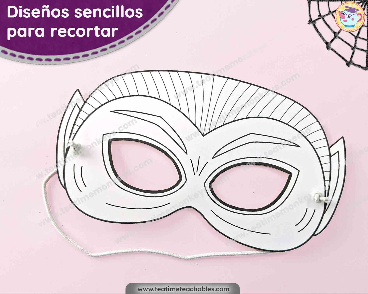 Las máscaras tienen formas simplificadas para facilitar el recorte, y guías para mostrarte dónde colocar el elástico. Además, dejan la nariz de los niños descubierta, por lo que son mucho más cómodas de usar que otros diseños en Internet.