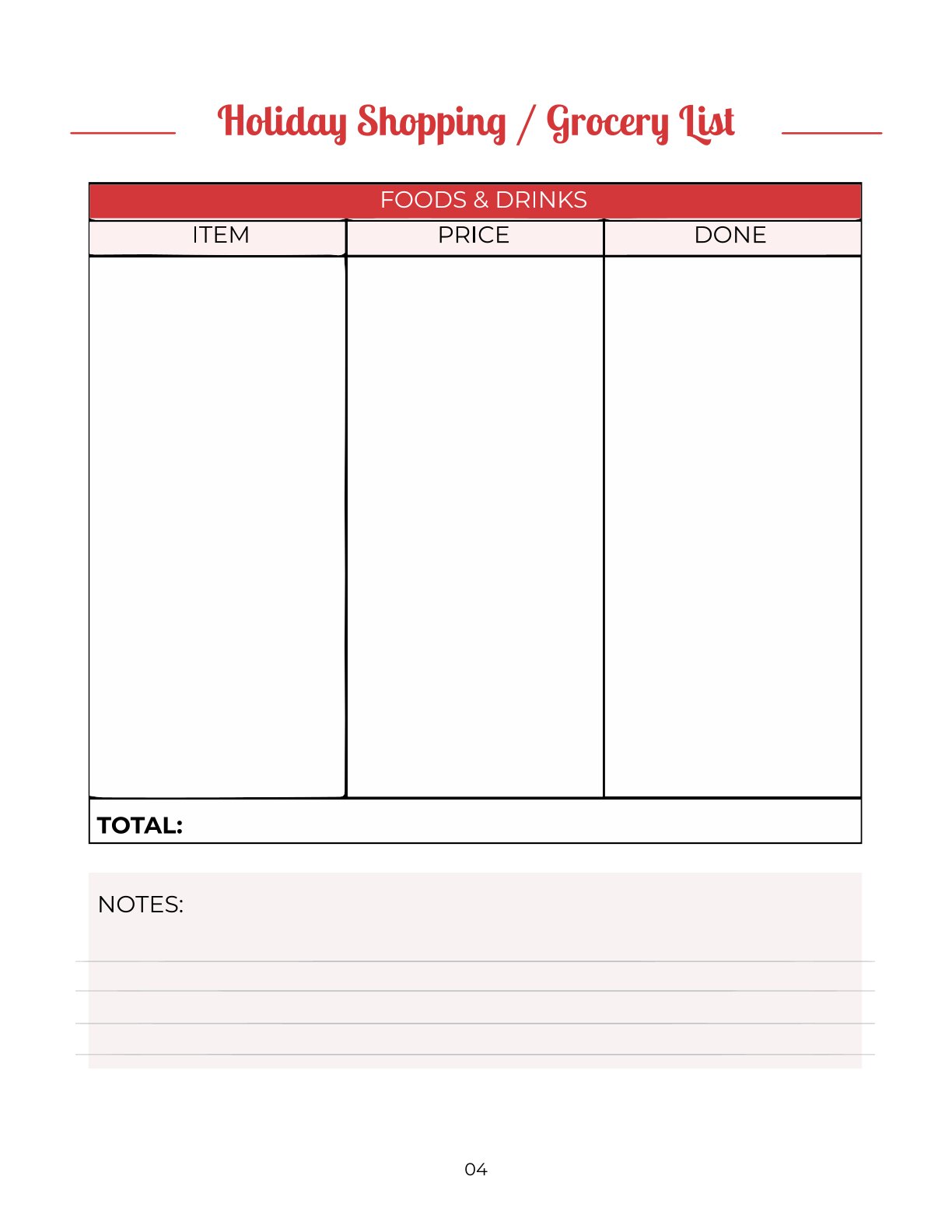Plan a cheerful holiday gathering without the chaos. This printable 10-page planner keeps every detail in one place: budget and quick to-do’s, grocery and gift lists, menu planning, RSVPs, and a clear program with a festive playlist. Perfect for family get-togethers, office parties, school events, neighborhood potlucks, church socials, and society celebrations.